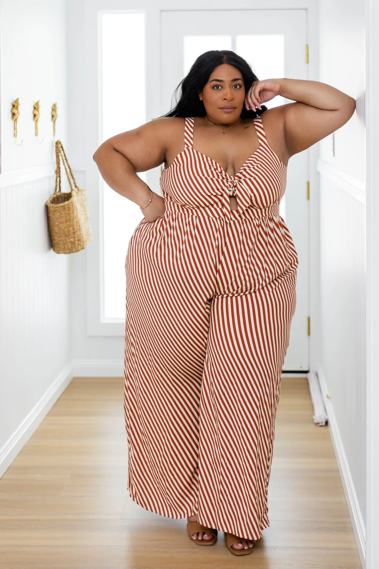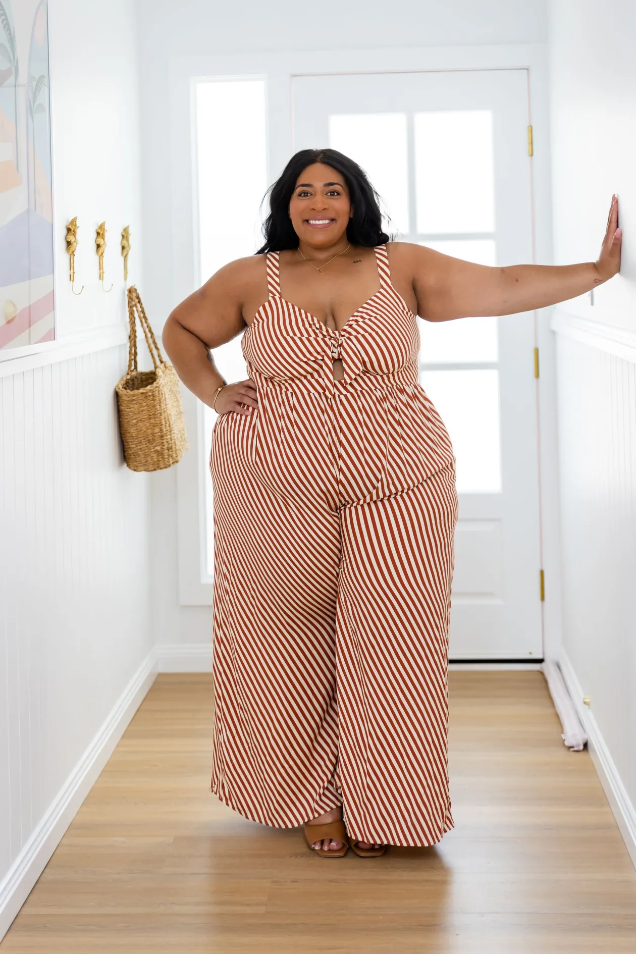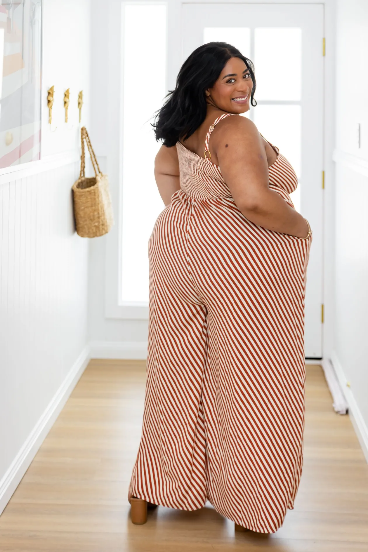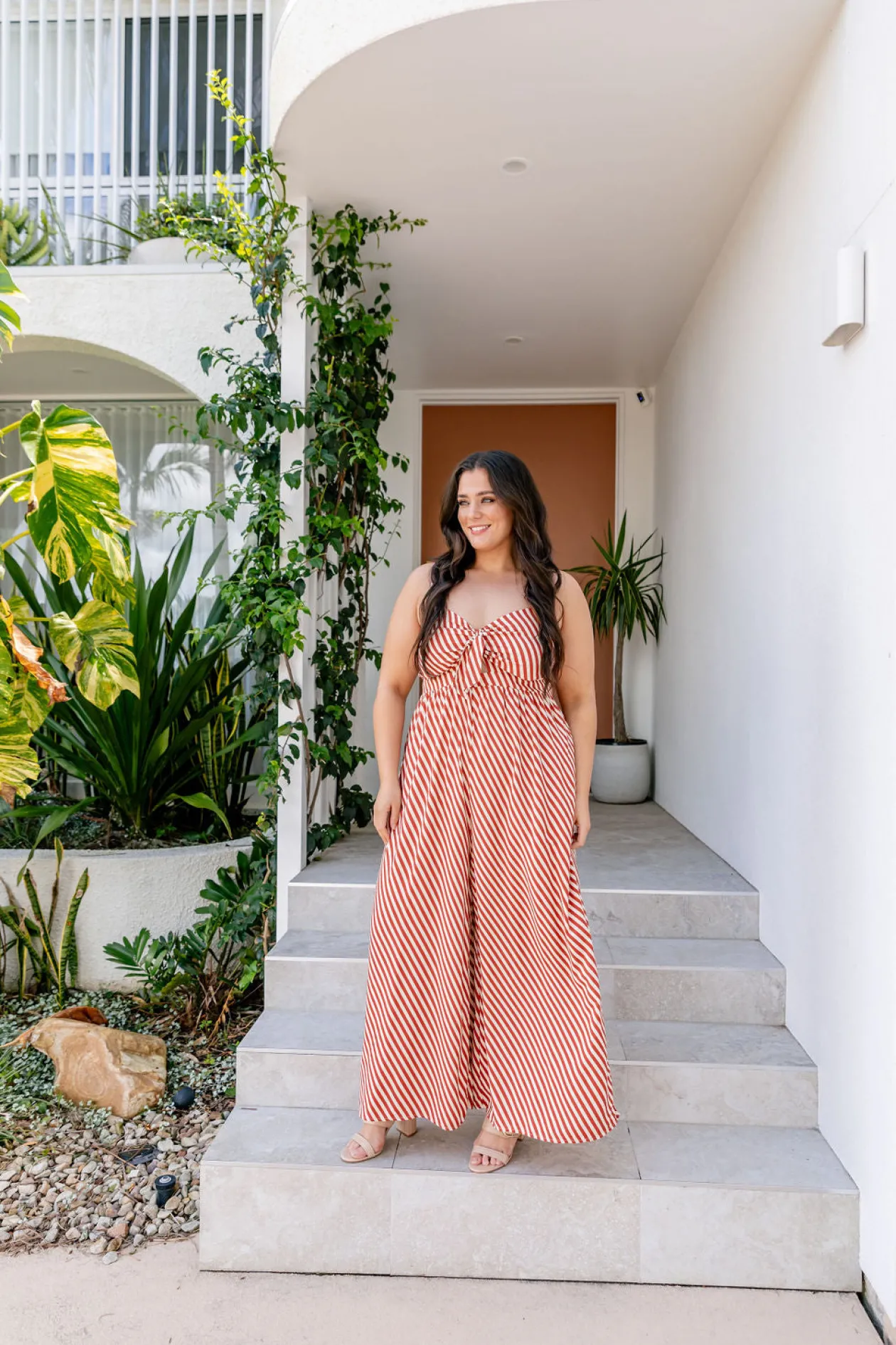 Say hello to the Christina Jumpsuit in Candy Stripe Rust—a playful twist on classic chic! With a flattering V-neckline and a cheeky cut-out under the bust, this jumpsuit is all about laid-back glam. Adjustable, bra-friendly straps and a tailored back give the perfect fit, while wide-leg pants and pockets keep it comfy and practical. Ready to turn heads wherever you go? You bet!