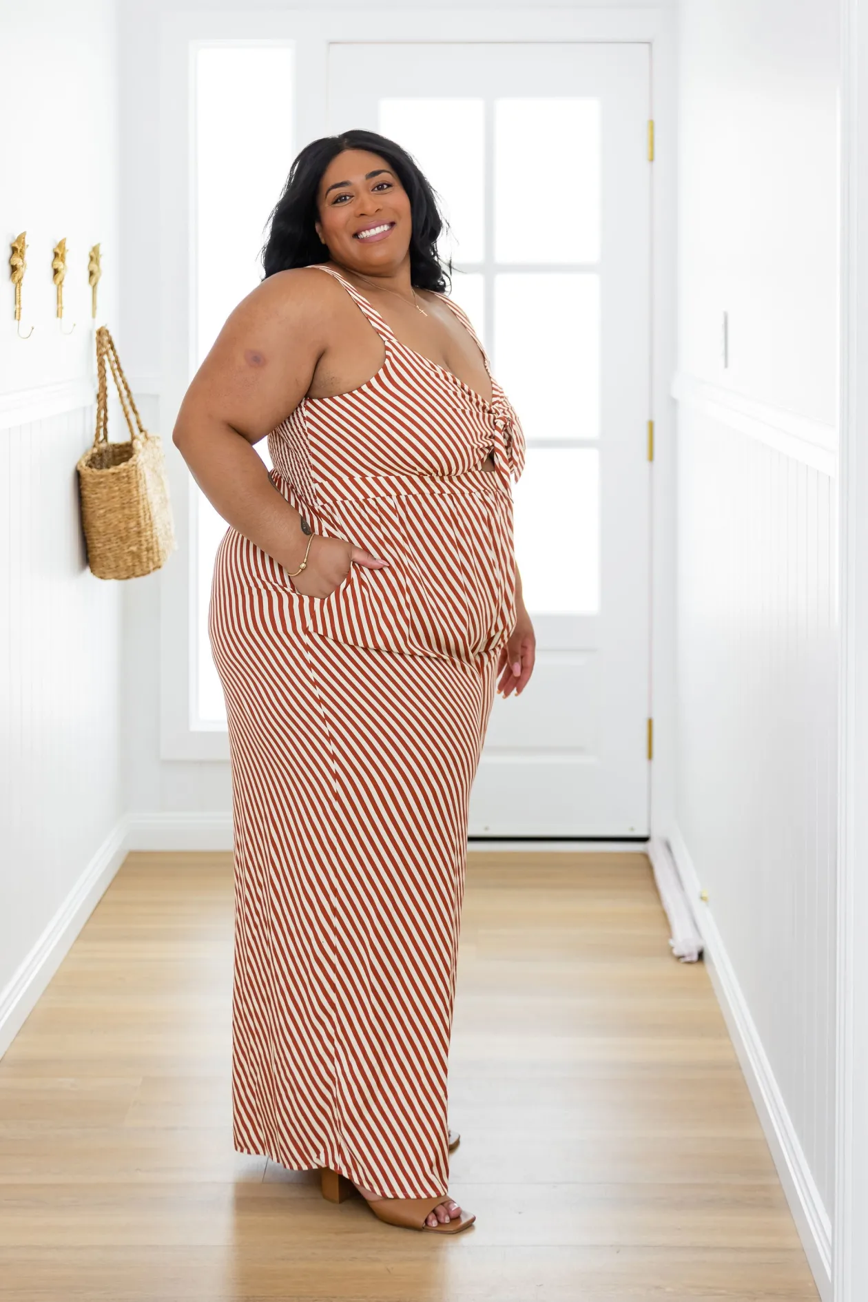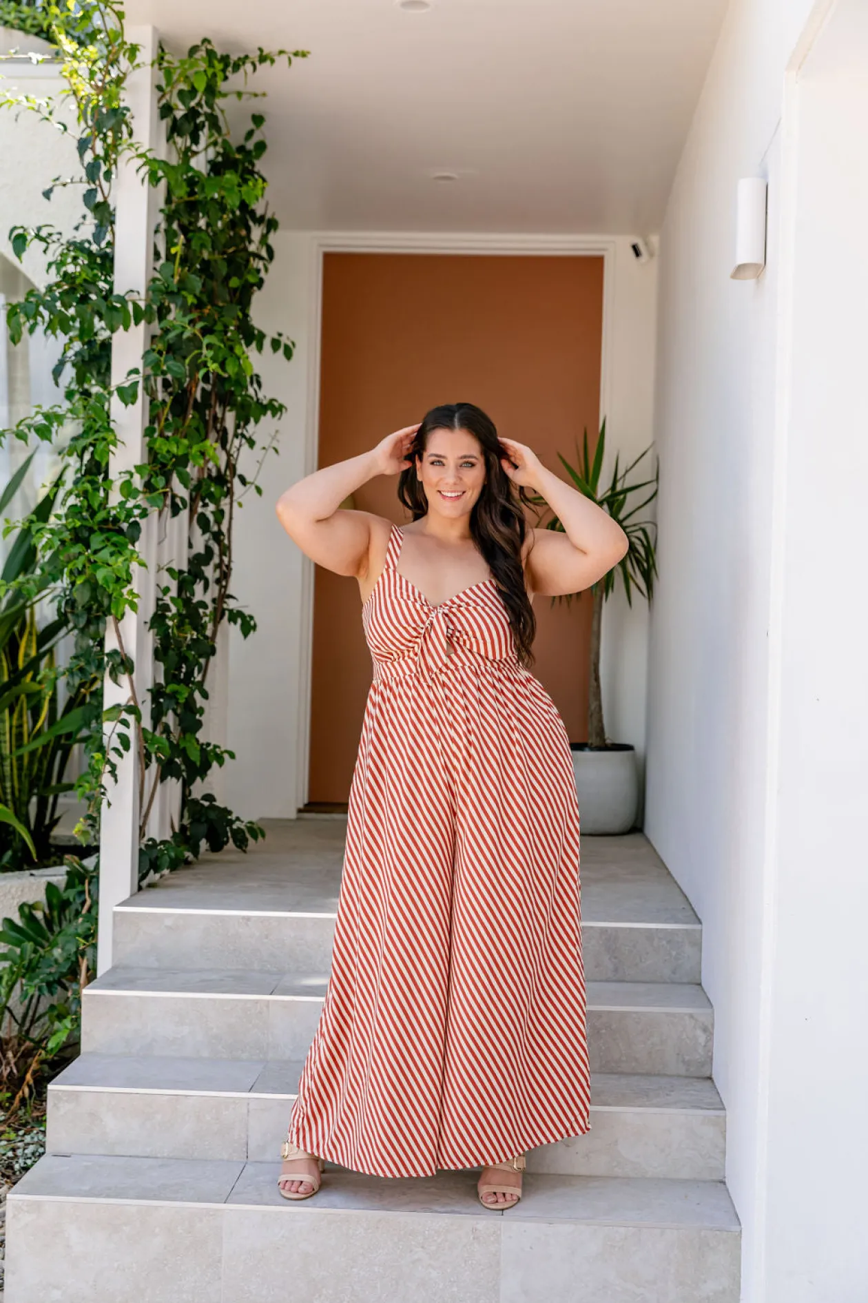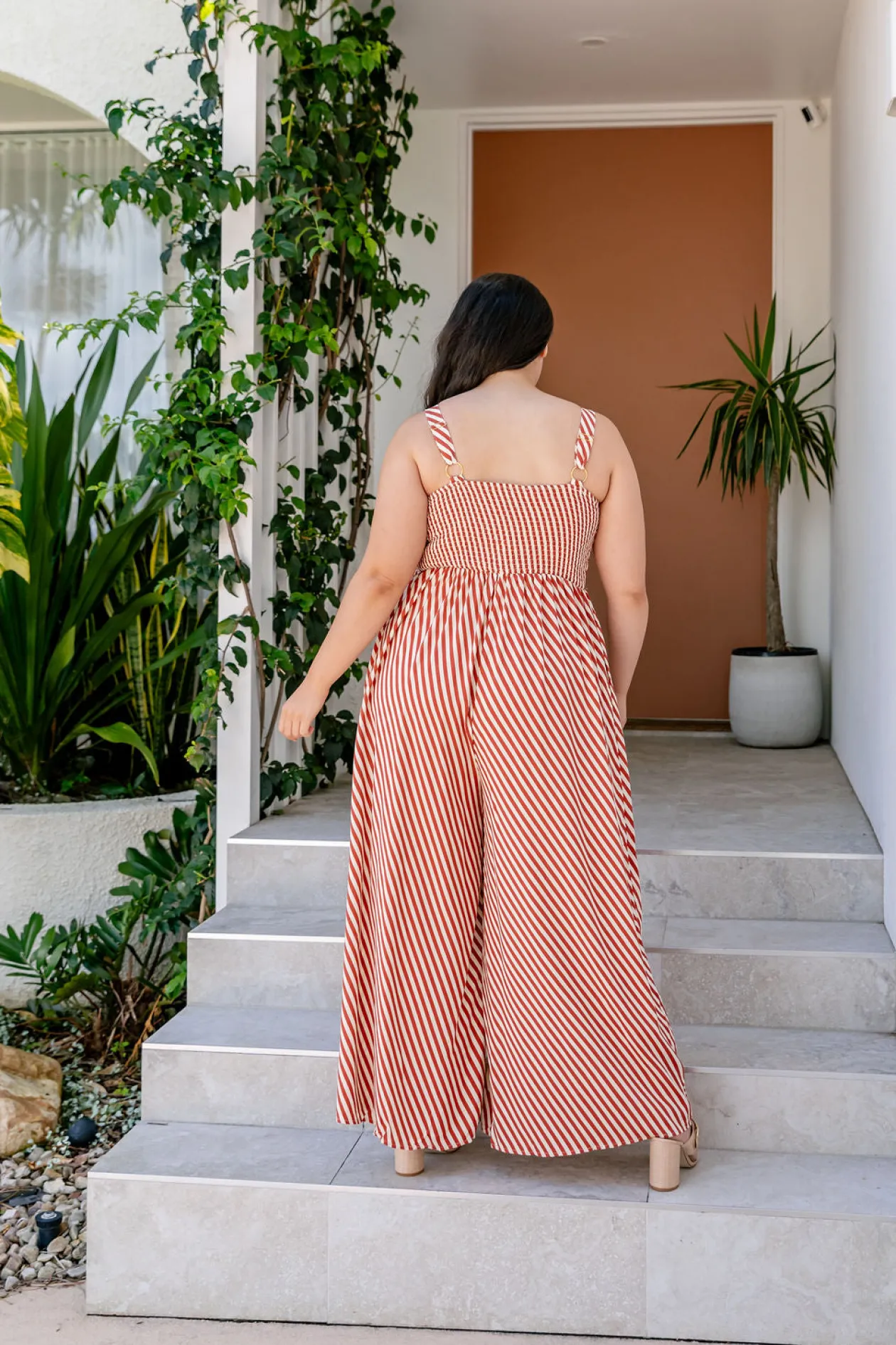 Say hello to the Christina Jumpsuit in Candy Stripe Rust—a playful twist on classic chic! With a flattering V-neckline and a cheeky cut-out under the bust, this jumpsuit is all about laid-back glam. Adjustable, bra-friendly straps and a tailored back give the perfect fit, while wide-leg pants and pockets keep it comfy and practical. Ready to turn heads wherever you go? You bet!