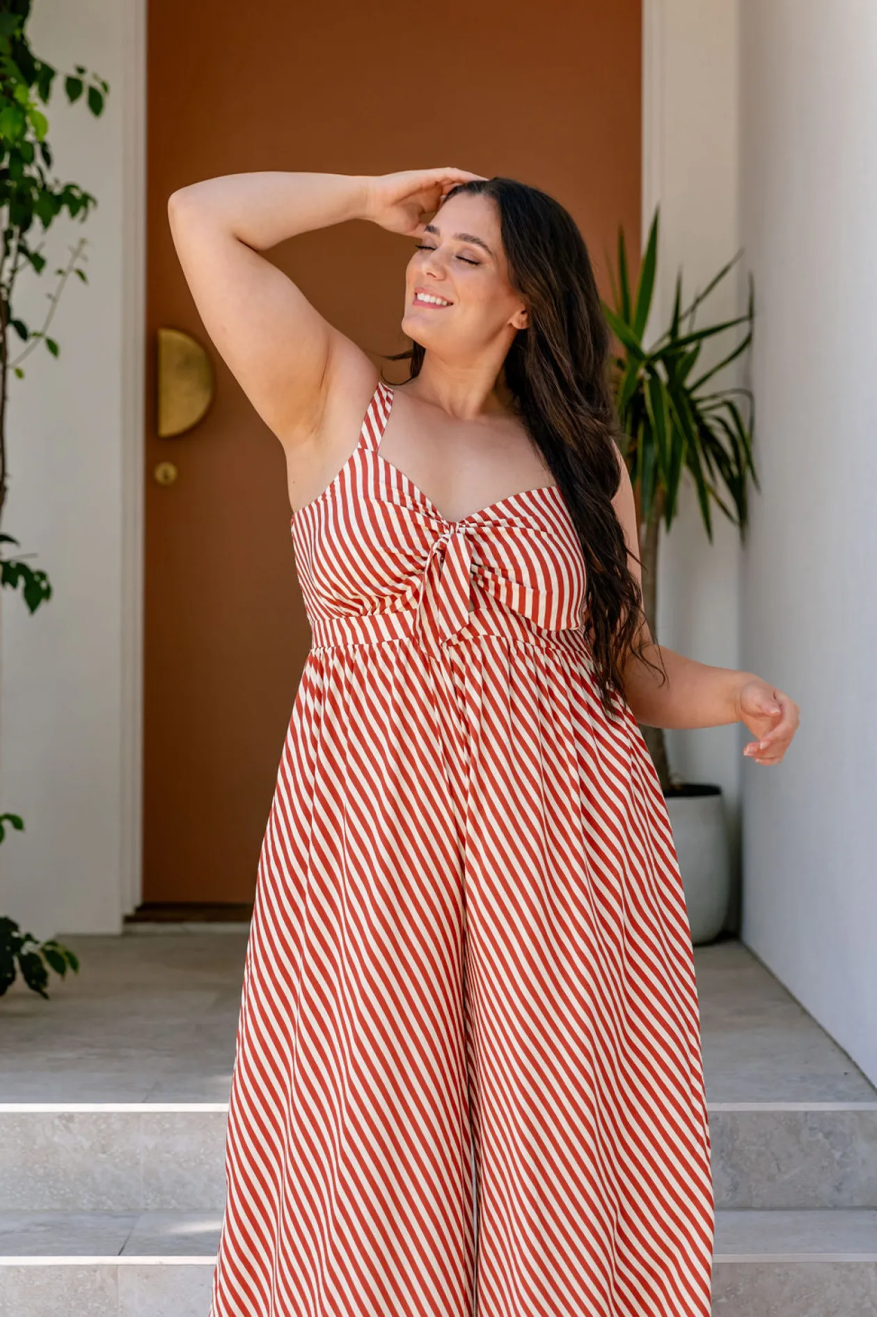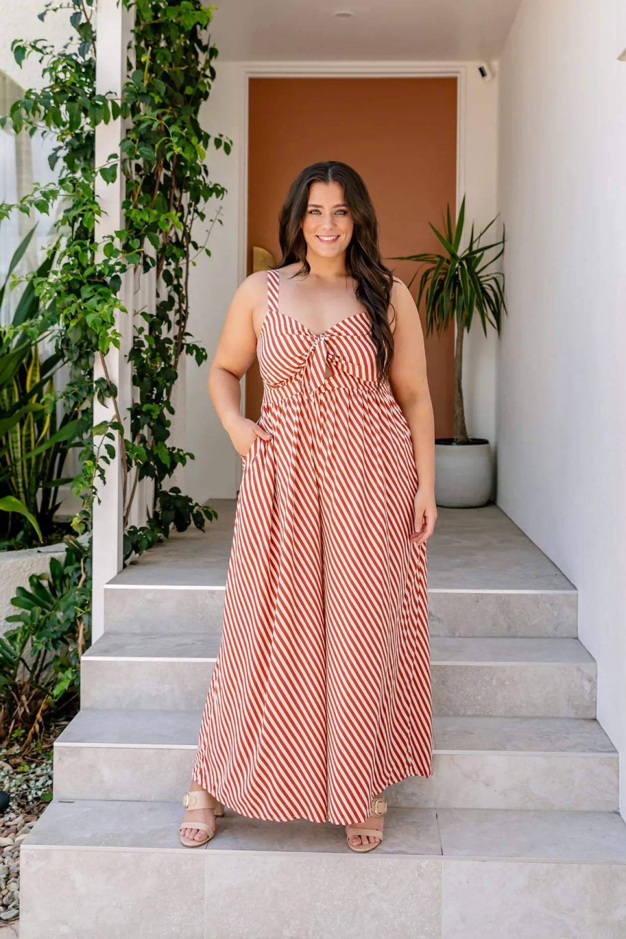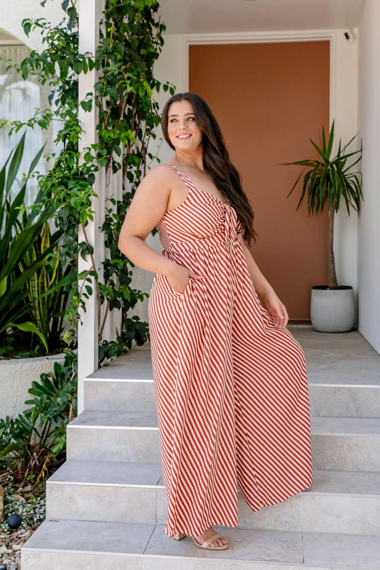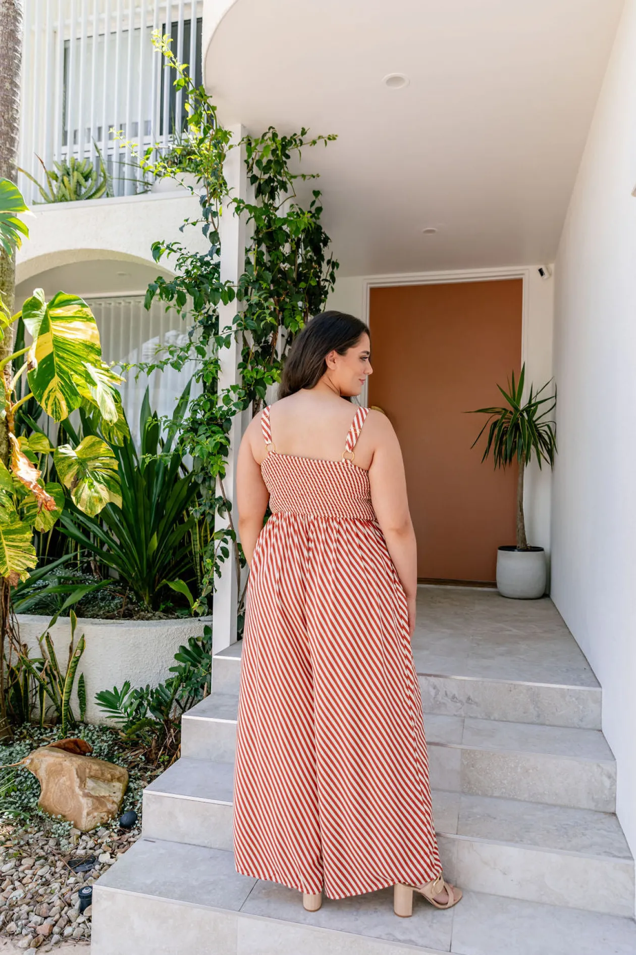 Say hello to the Christina Jumpsuit in Candy Stripe Rust—a playful twist on classic chic! With a flattering V-neckline and a cheeky cut-out under the bust, this jumpsuit is all about laid-back glam. Adjustable, bra-friendly straps and a tailored back give the perfect fit, while wide-leg pants and pockets keep it comfy and practical. Ready to turn heads wherever you go? You bet!