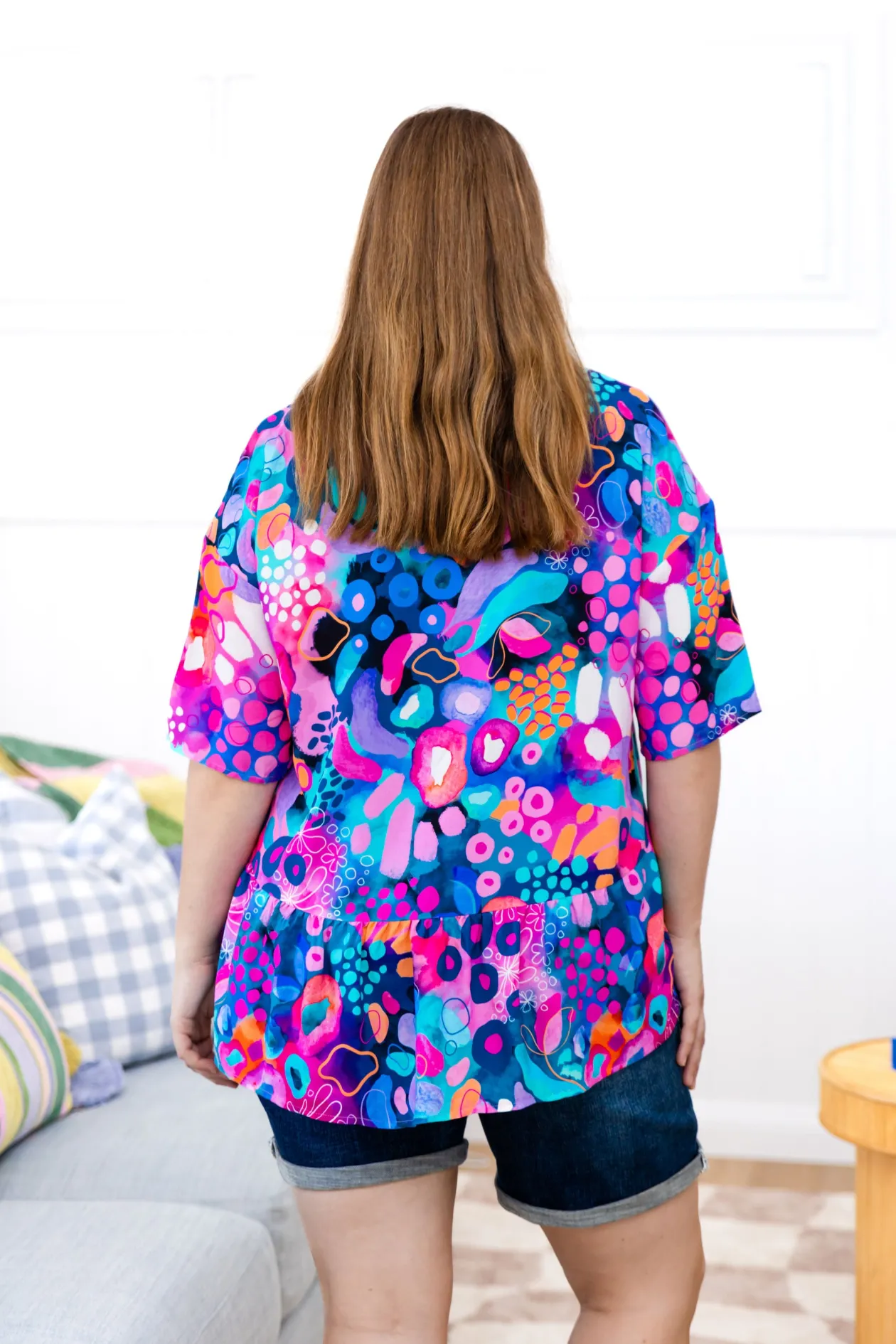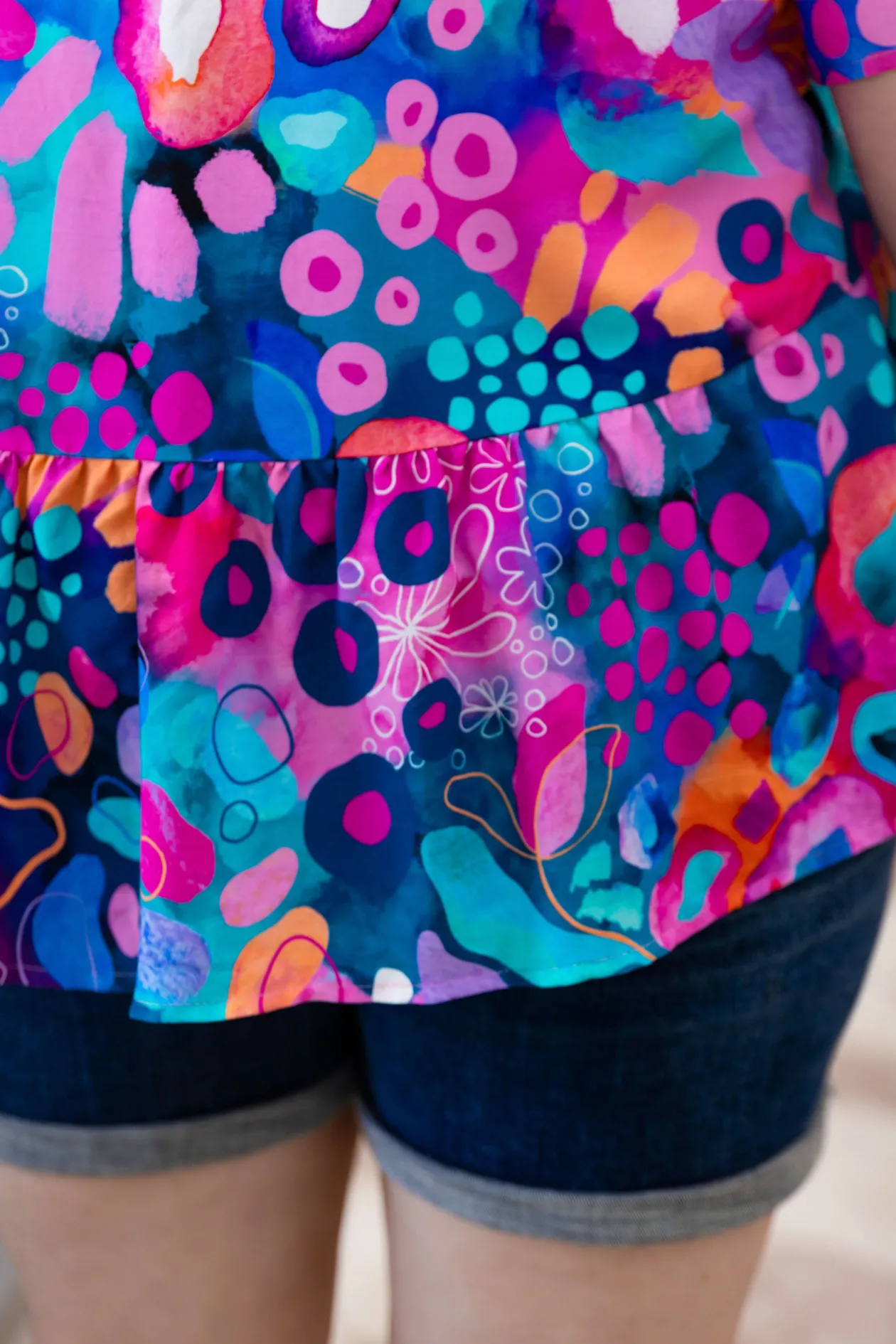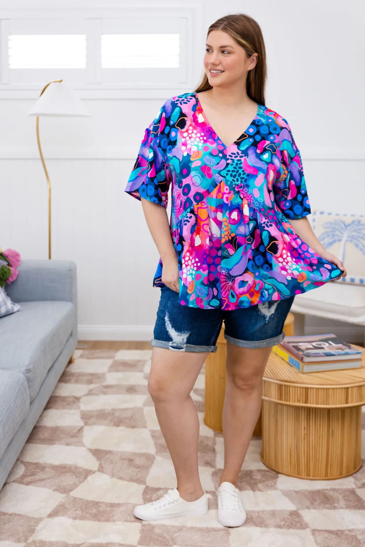 Add a pop of fun to your wardrobe with the Peak Top in Midnight Safari by Kasey Rainbow! Featuring a flattering V-gathering under the bust, playful frill hem, and a relaxed fit, this top is perfect for effortless style. The 3/4 sleeves bring an extra touch of flair, making it your go-to for both casual days and nights out. Available in sizes 6-30!