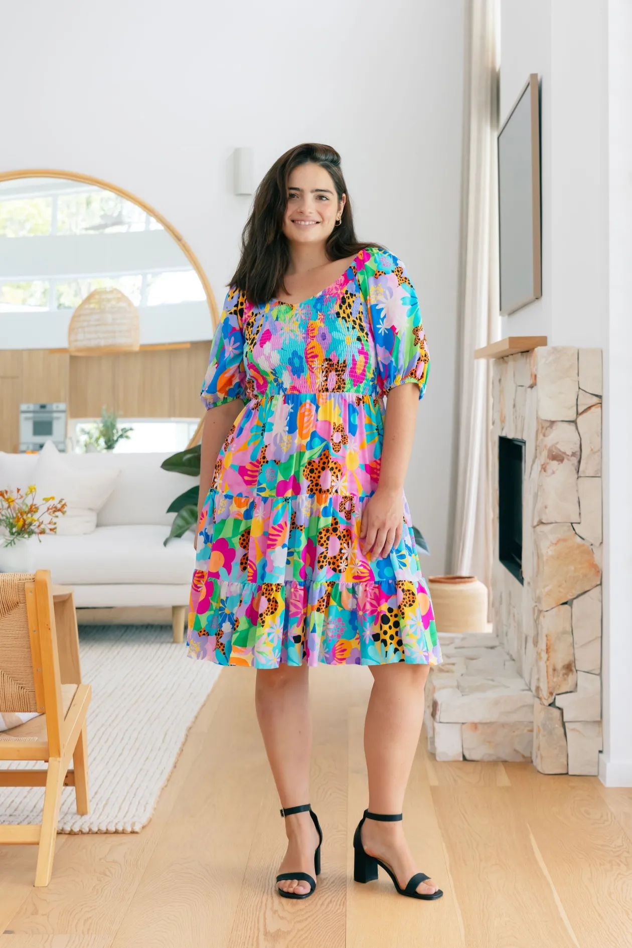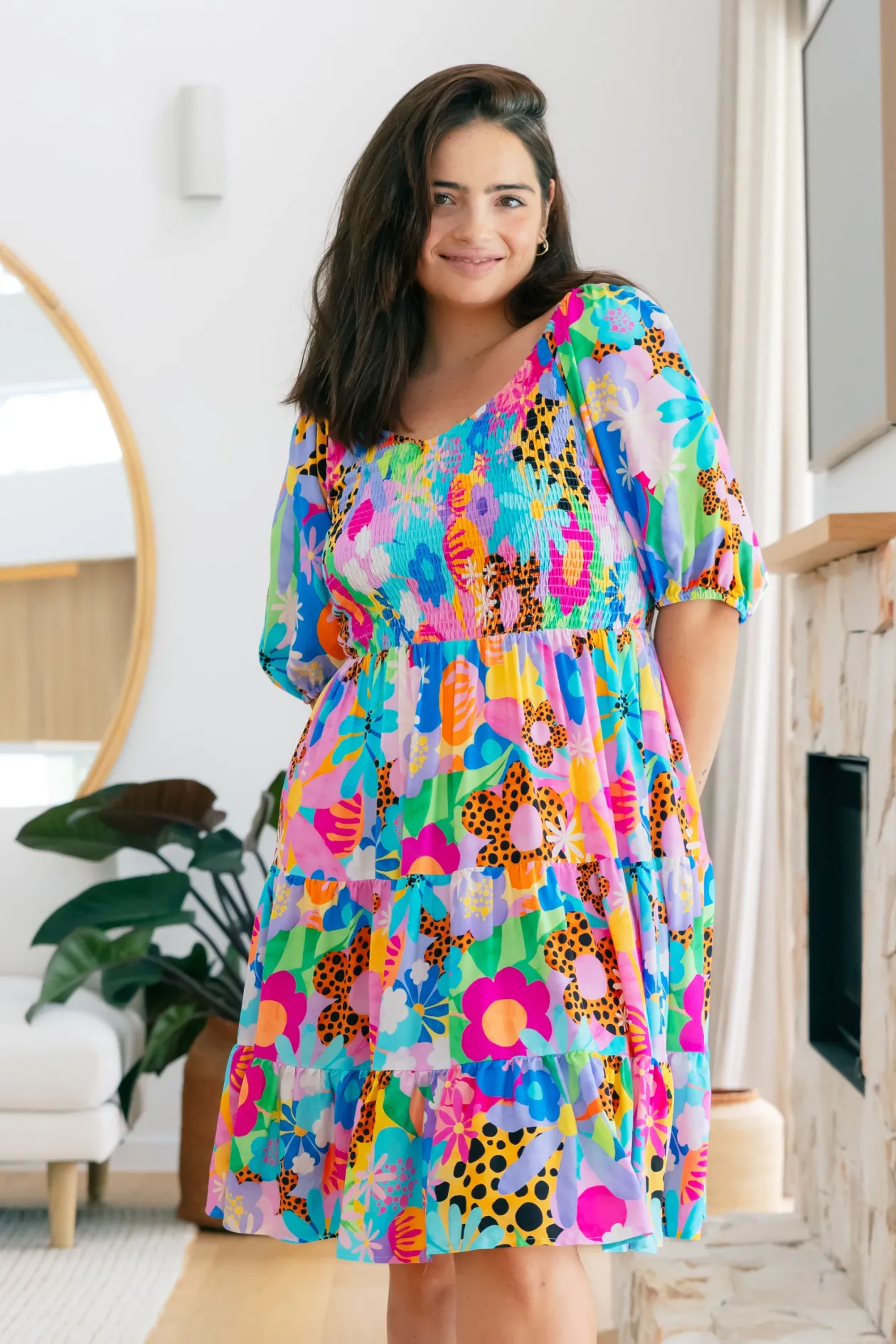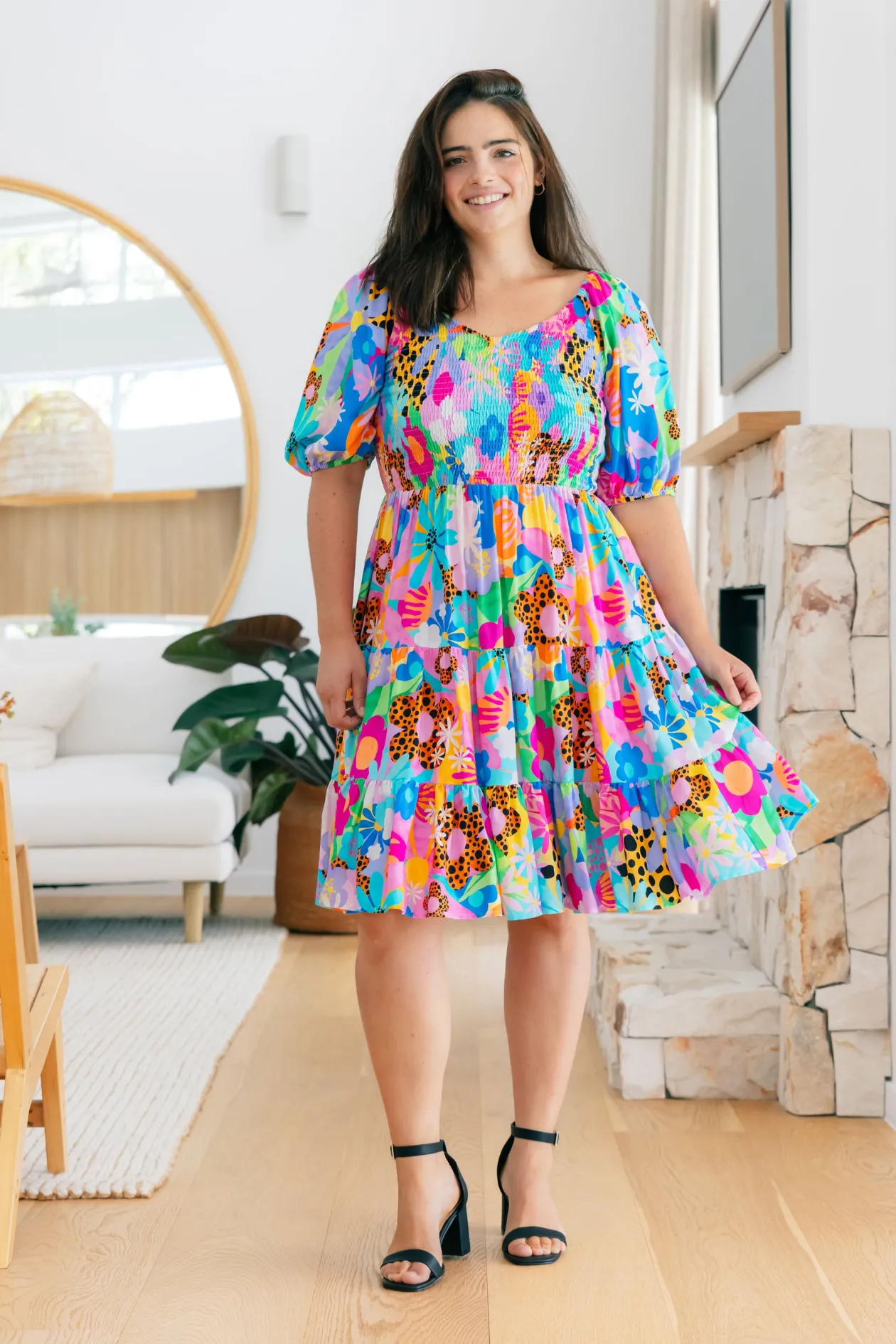 Get ready to shine in the Peri Party Dress in Floral Fancy! This delightful dress features a flattering V-neckline and a beautifully shirred bust that hugs your curves just right. The puff sleeves with elastic cuffs add a playful touch, while the tiered hem creates a fun, twirling effect. Wear it on or off the shoulder to match your mood—this dress is ready for any occasion!