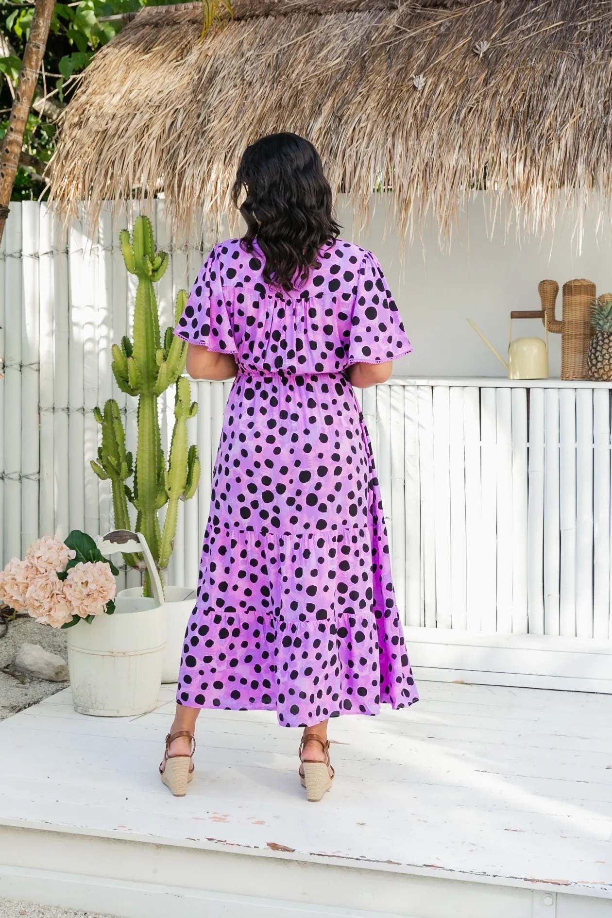 Make a bold statement and unleash your inner wild side with the Charlize Dress in Purple Cheetah Print by Australian artist Kasey Rainbow. This V-neckline dress features functional front buttons and flutter sleeves with broderie detail. Stay comfortable all day with the elastic waistband and a built-in modesty panel.