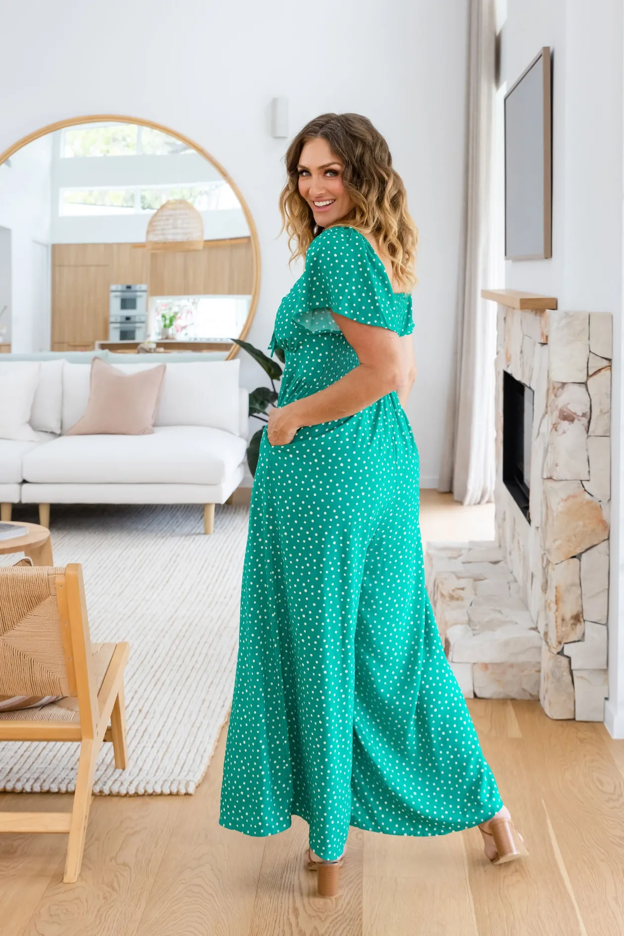 Celebrate the season in the Hazel Jumpsuit! With a flattering V-neckline and tie detail, playful flutter short sleeves, and a comfy shirred back, this wide-leg beauty is perfect for twirling at holiday gatherings. Shine bright at every festive occasion!