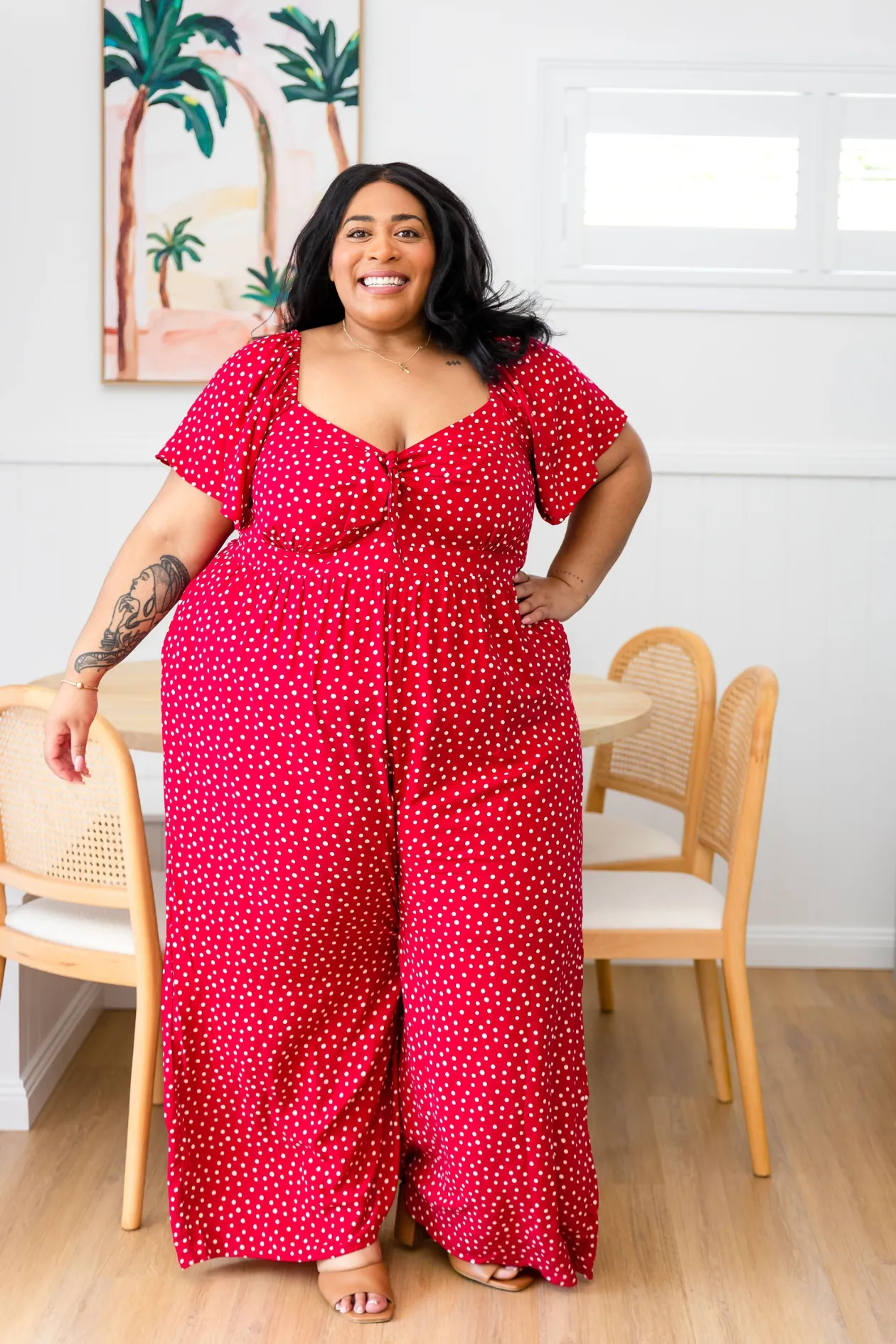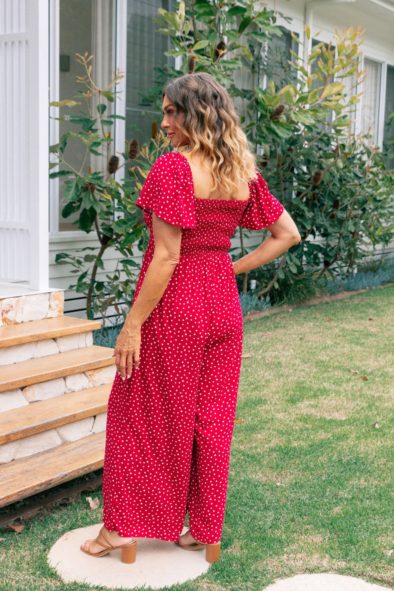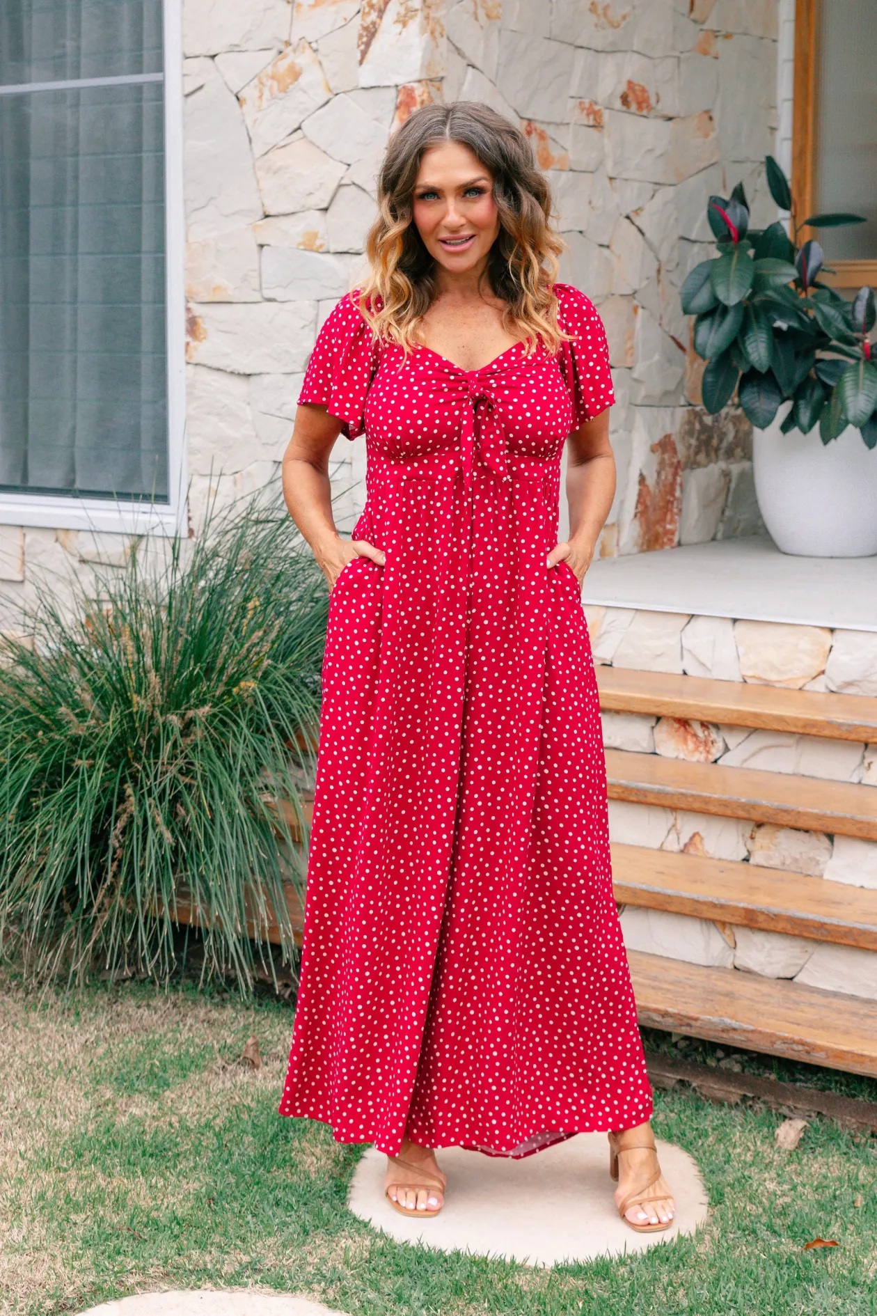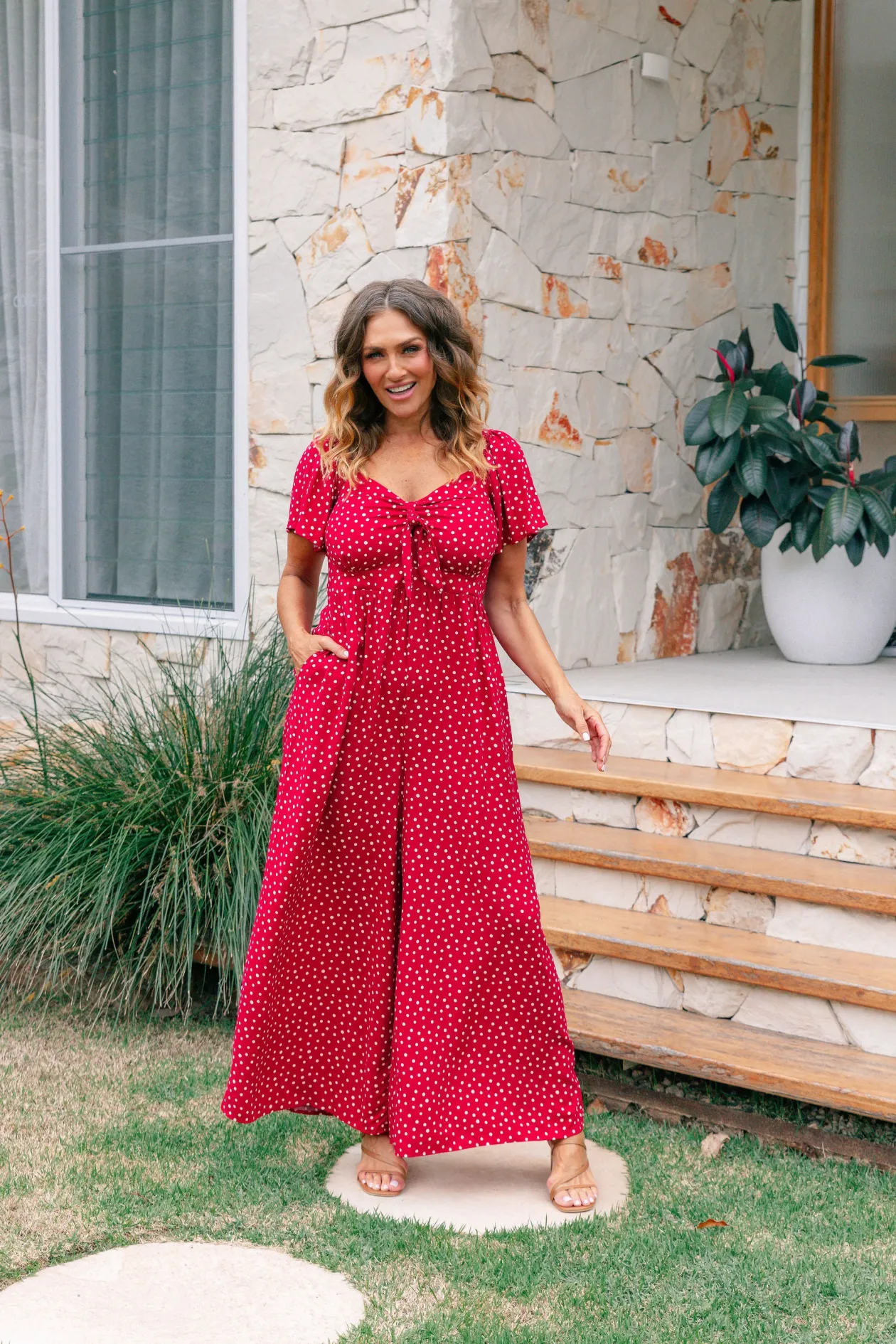 Celebrate the season in the Hazel Jumpsuit! With a flattering V-neckline and tie detail, playful flutter short sleeves, and a comfy shirred back, this wide-leg beauty is perfect for twirling at holiday gatherings. Shine bright at every festive occasion!