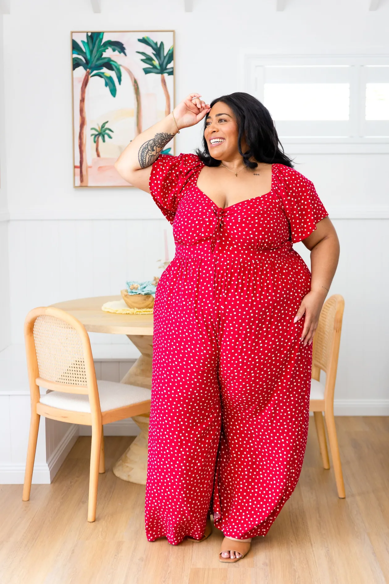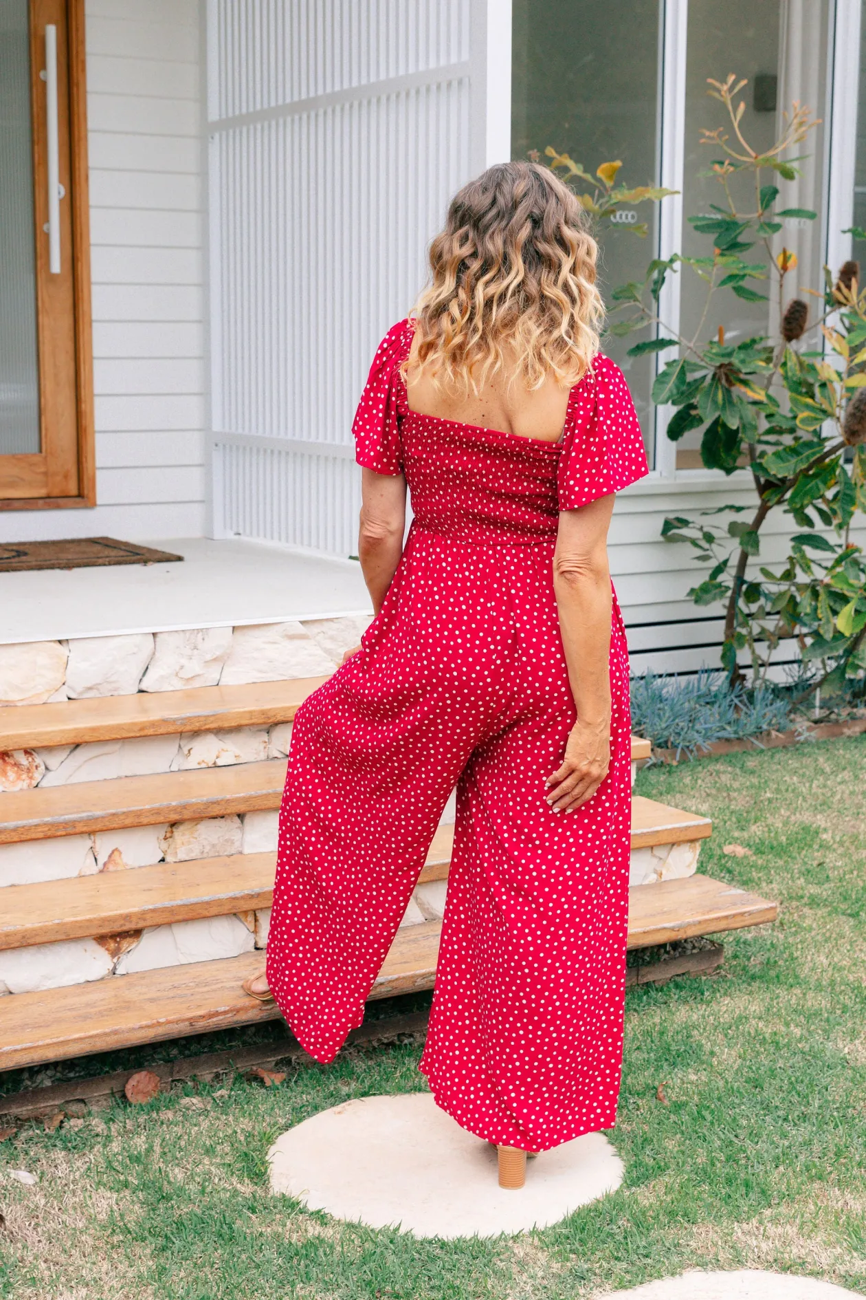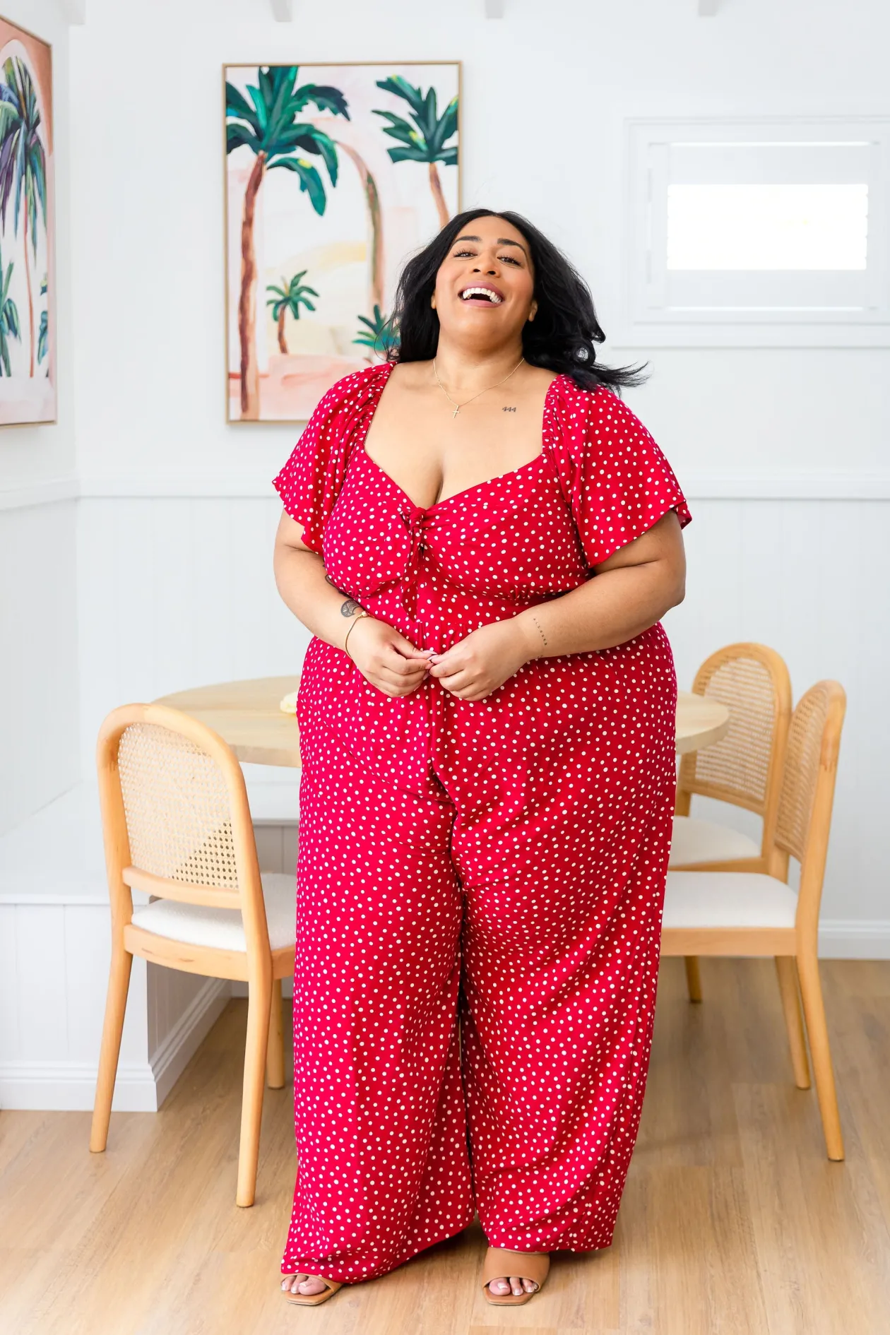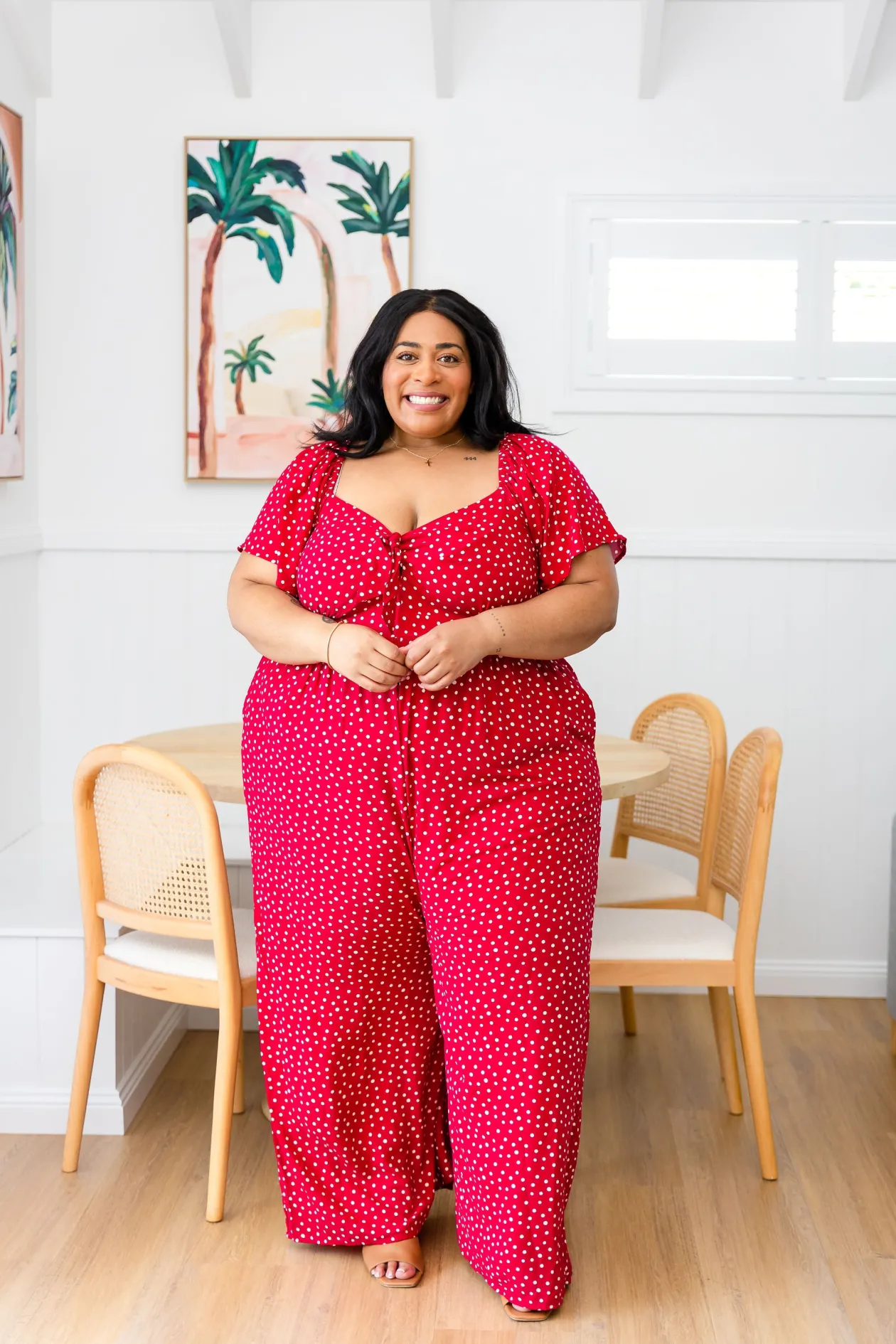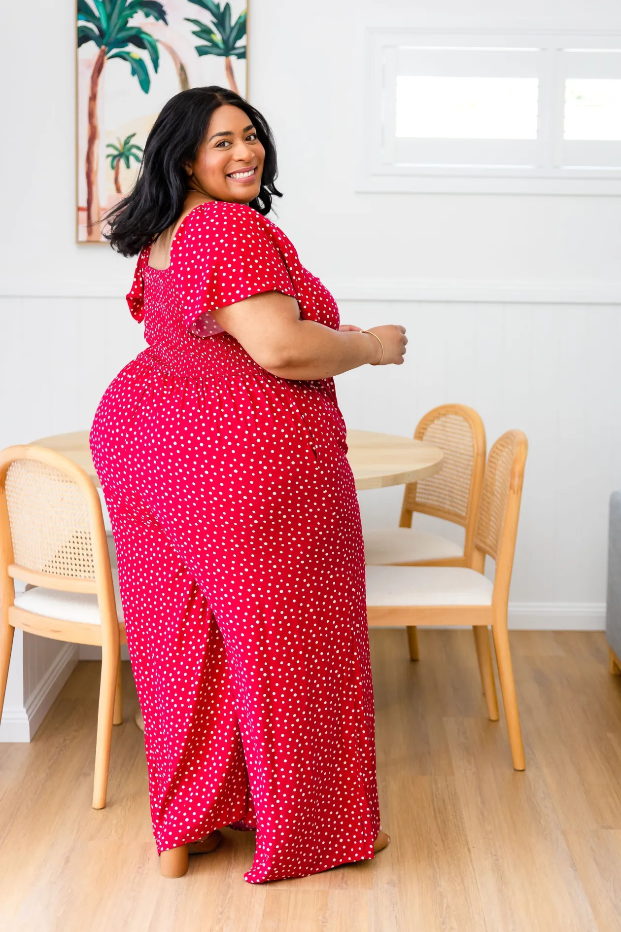 Celebrate the season in the Hazel Jumpsuit! With a flattering V-neckline and tie detail, playful flutter short sleeves, and a comfy shirred back, this wide-leg beauty is perfect for twirling at holiday gatherings. Shine bright at every festive occasion!
