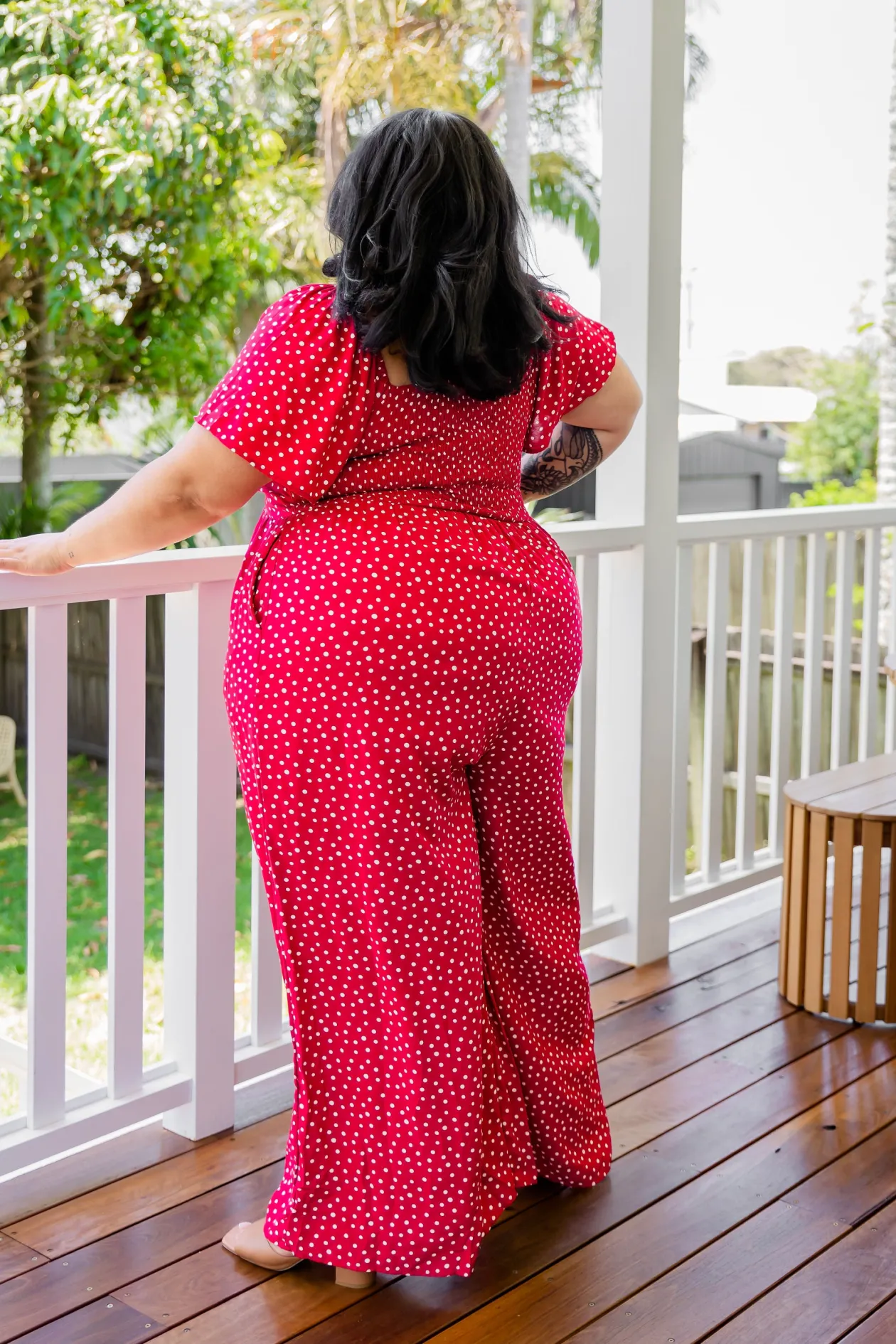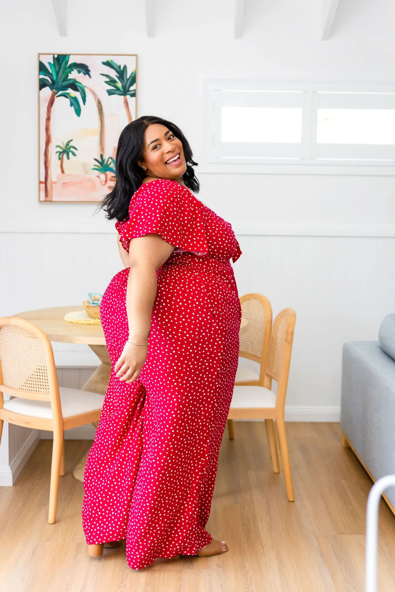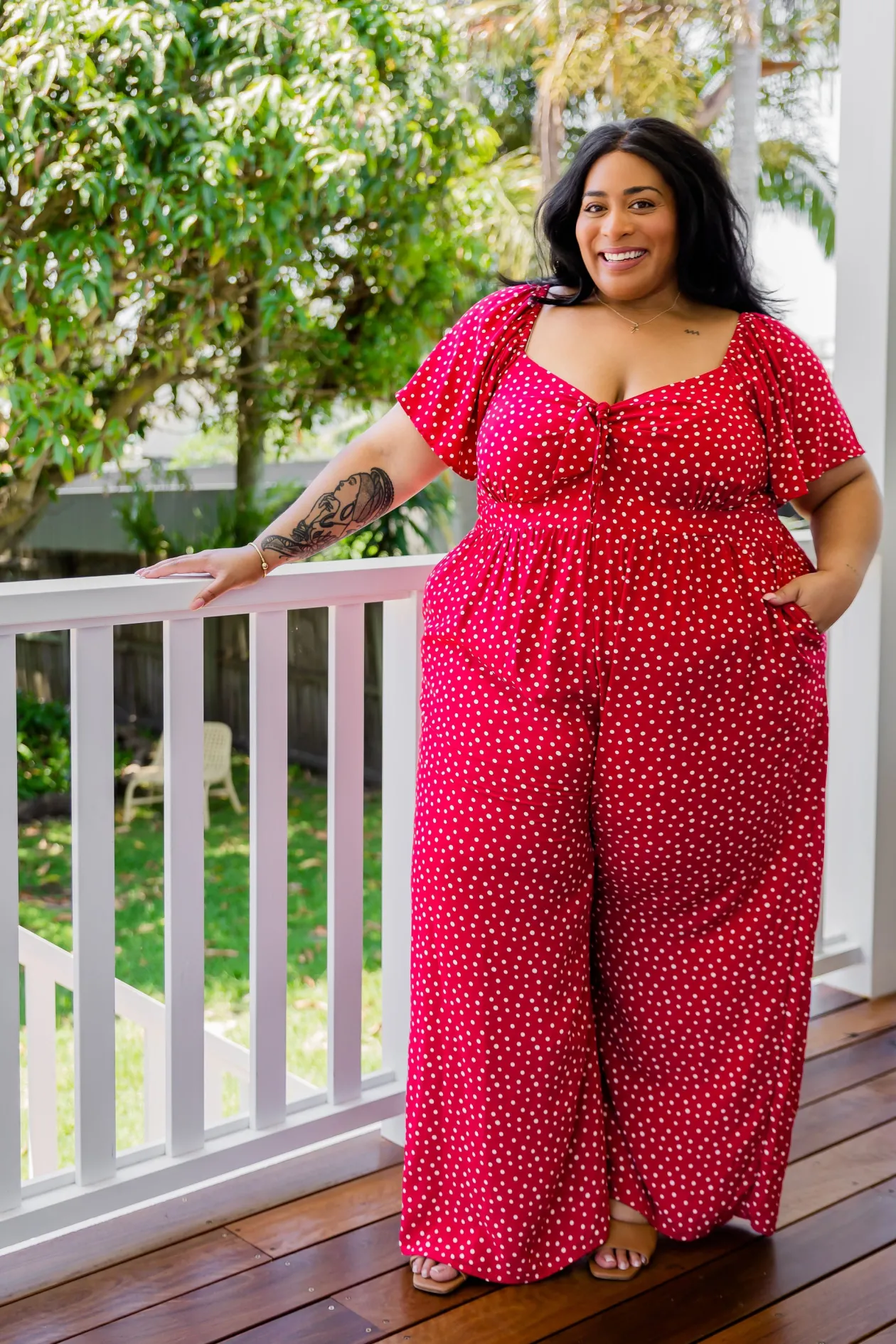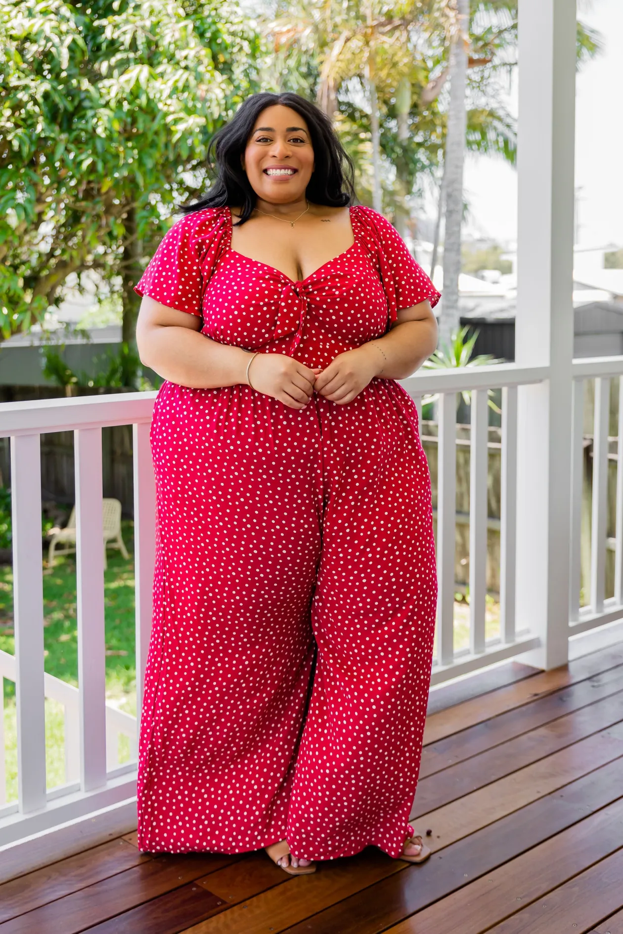 Celebrate the season in the Hazel Jumpsuit! With a flattering V-neckline and tie detail, playful flutter short sleeves, and a comfy shirred back, this wide-leg beauty is perfect for twirling at holiday gatherings. Shine bright at every festive occasion!