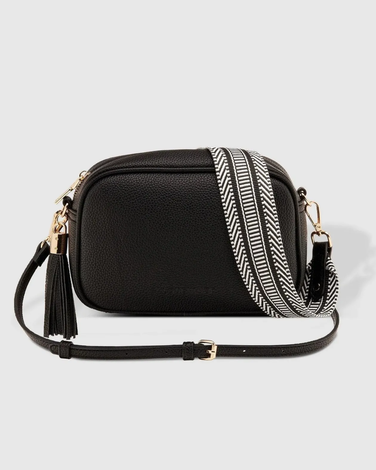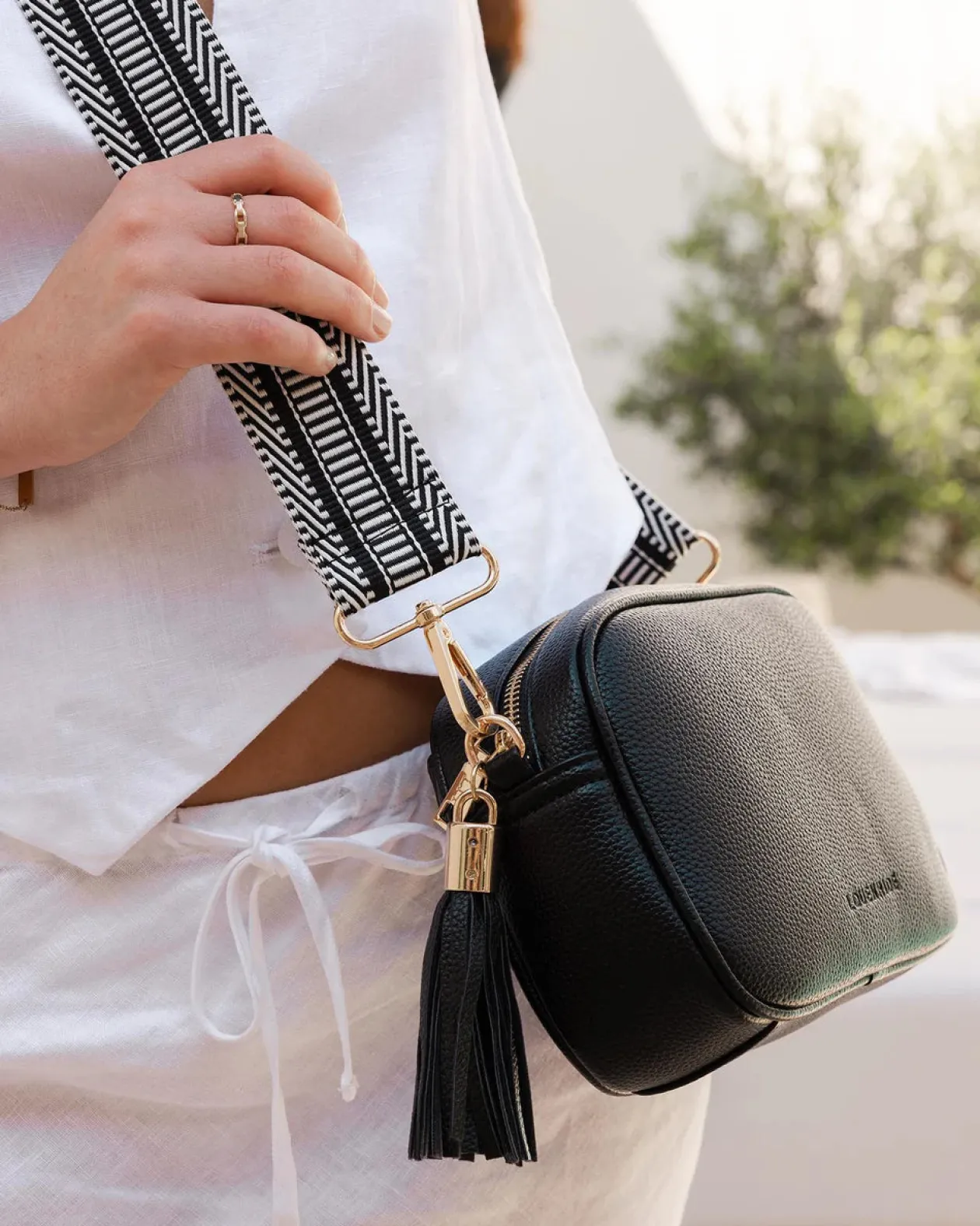 The Louenhide Jacinta Black White Crossbody Bag is the ultimate cool-girl bag, featuring a complimentary detachable guitar strap, now in new bright patterned prints. Feel fun and sporty with our Jacinta Black White over your shoulder. Walk out in style with this colourful accessory, secure your essentials with its slip and zip pockets. Available in a range of classic & preppy colours and designed to style effortlessly with your daily wardrobe. The Jacinta Black White is a staple in the Louenhide world, proving to be a bestseller season on season.