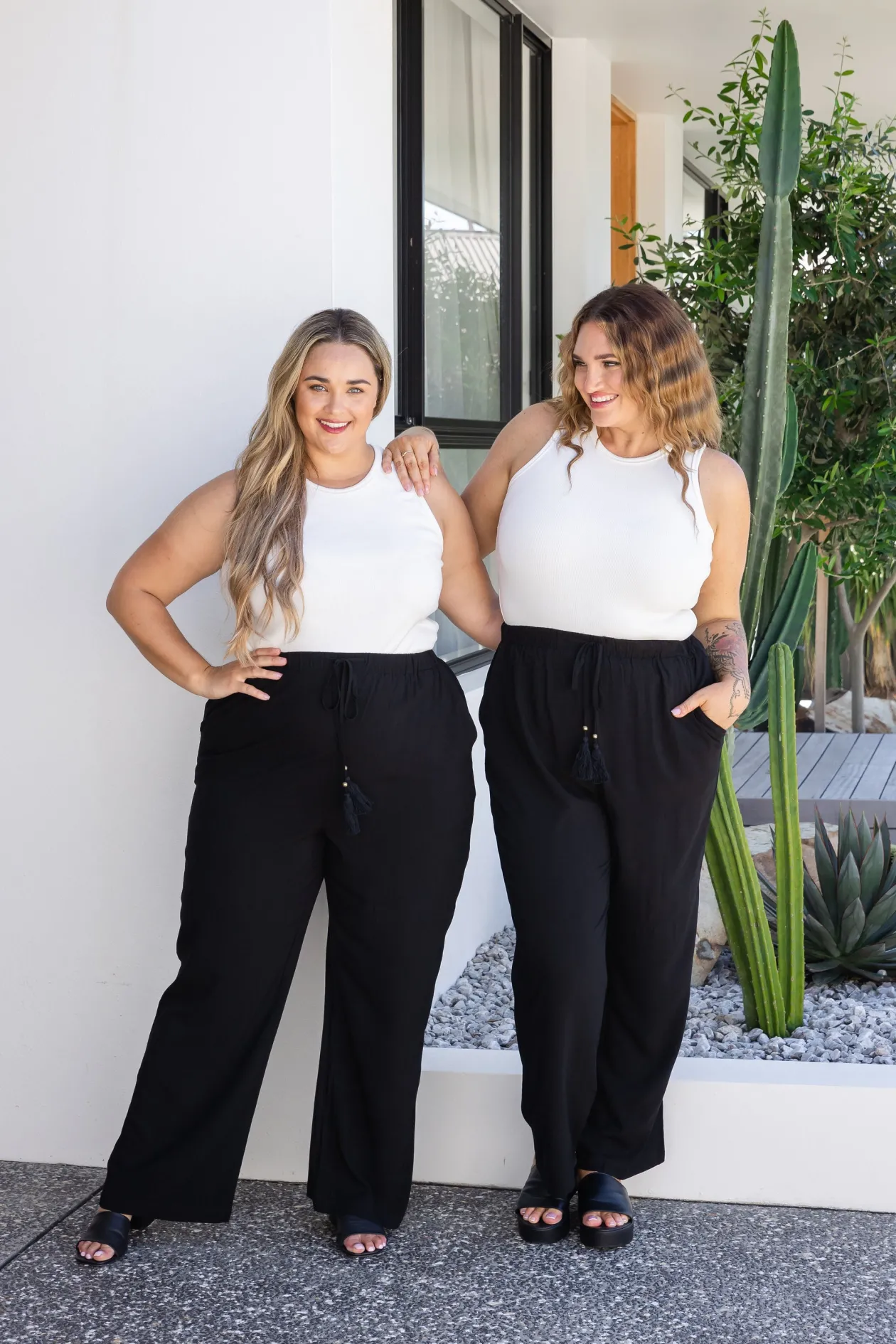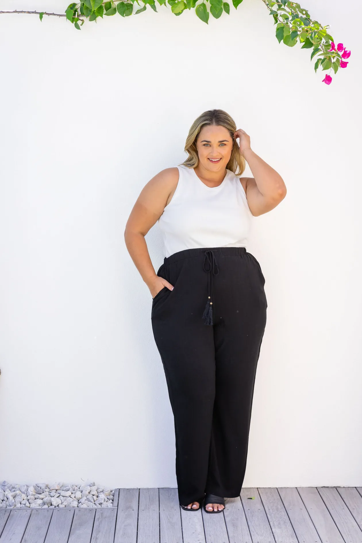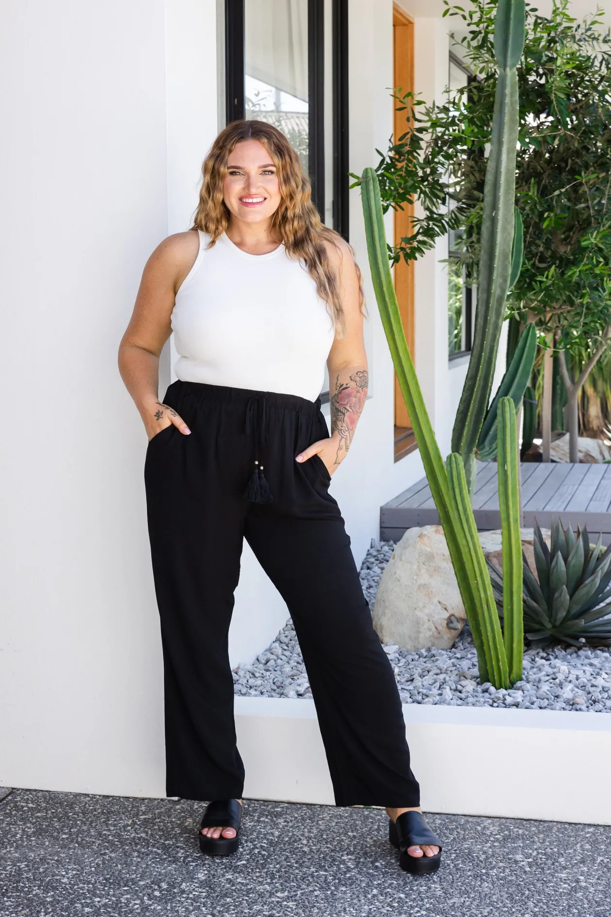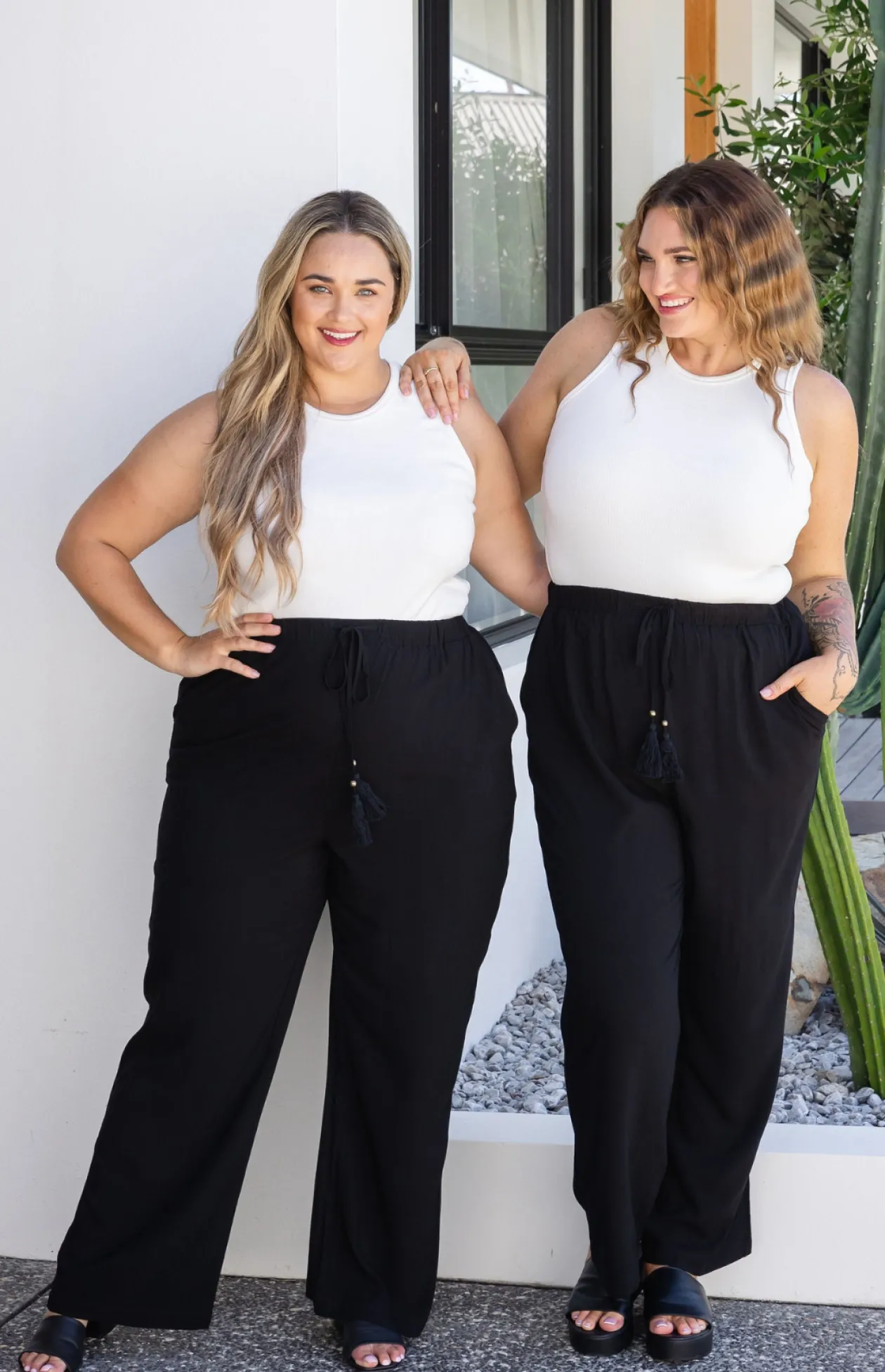 Introducing the Nora Pants, the perfect addition to your wardrobe! Made with comfort in mind, these new pants feature an elastic waistband and convenient pockets. The Nora Pants feature a tassel tie for added flair. Now available in black, these pants are a wardrobe staple.