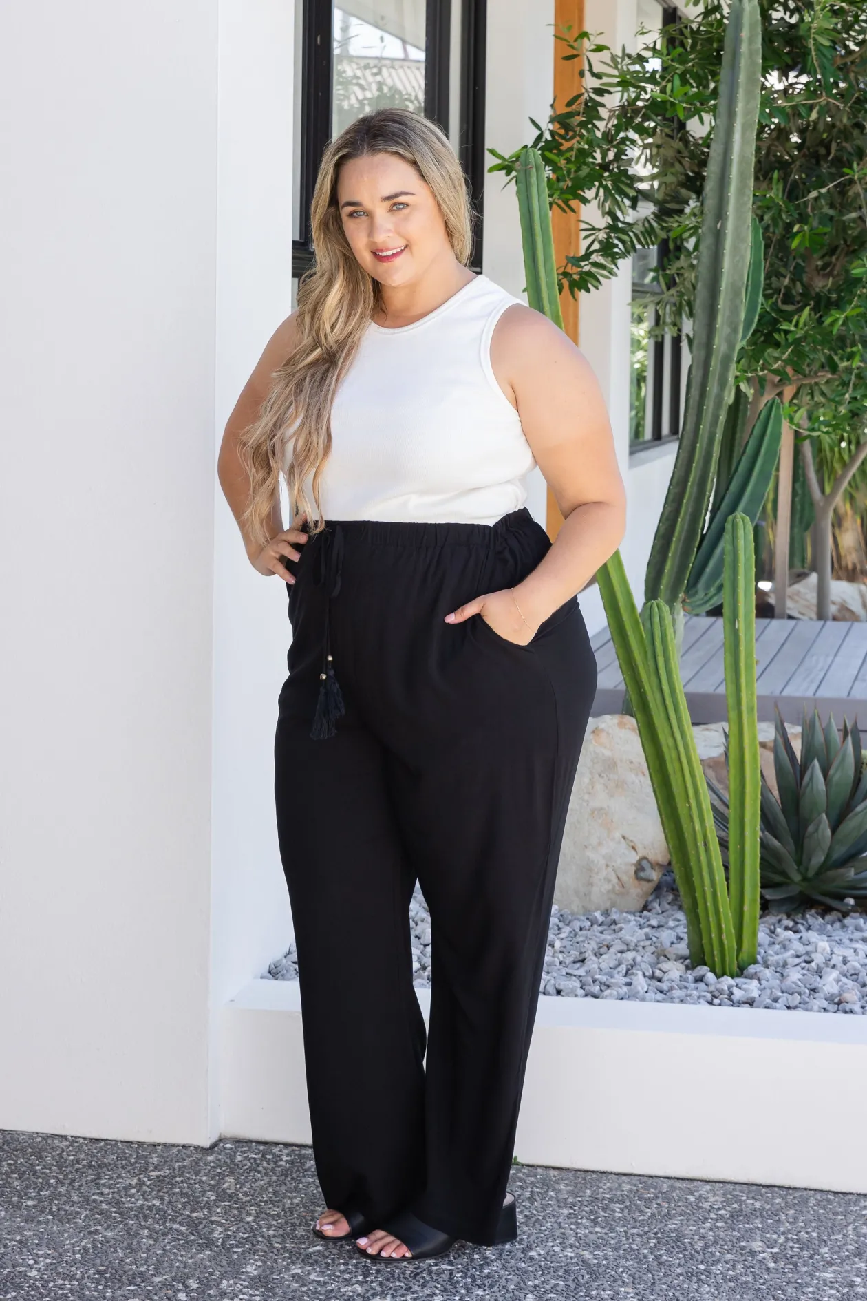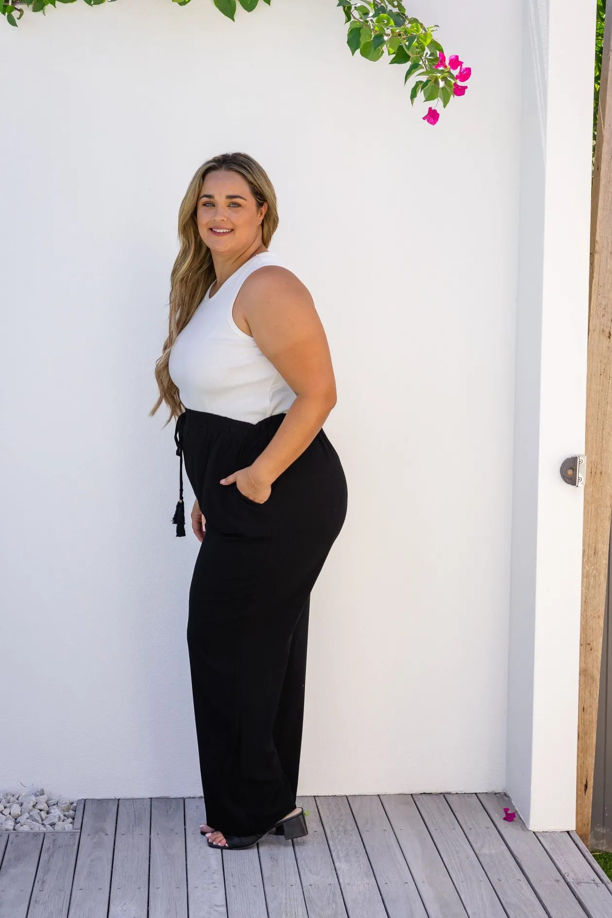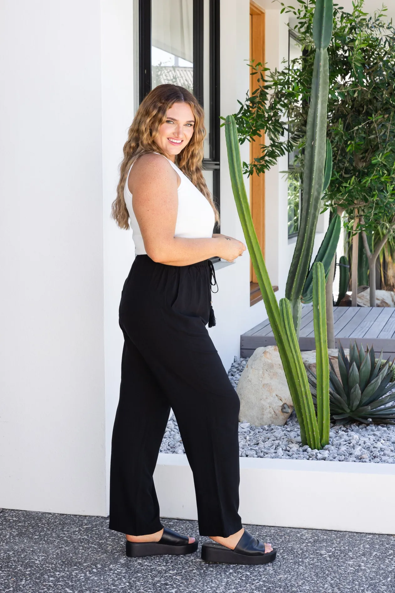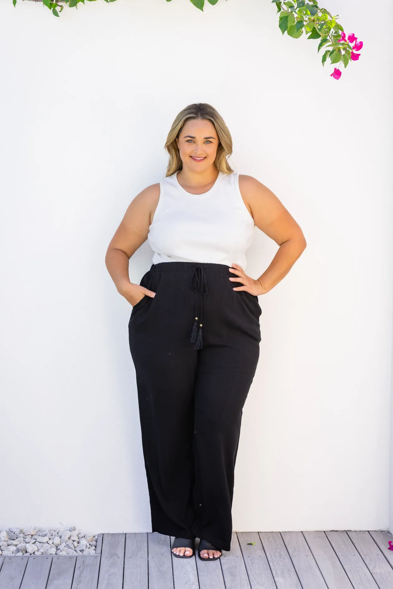Introducing the Nora Pants, the perfect addition to your wardrobe! Made with comfort in mind, these new pants feature an elastic waistband and convenient pockets. The Nora Pants feature a tassel tie for added flair. Now available in black, these pants are a wardrobe staple.