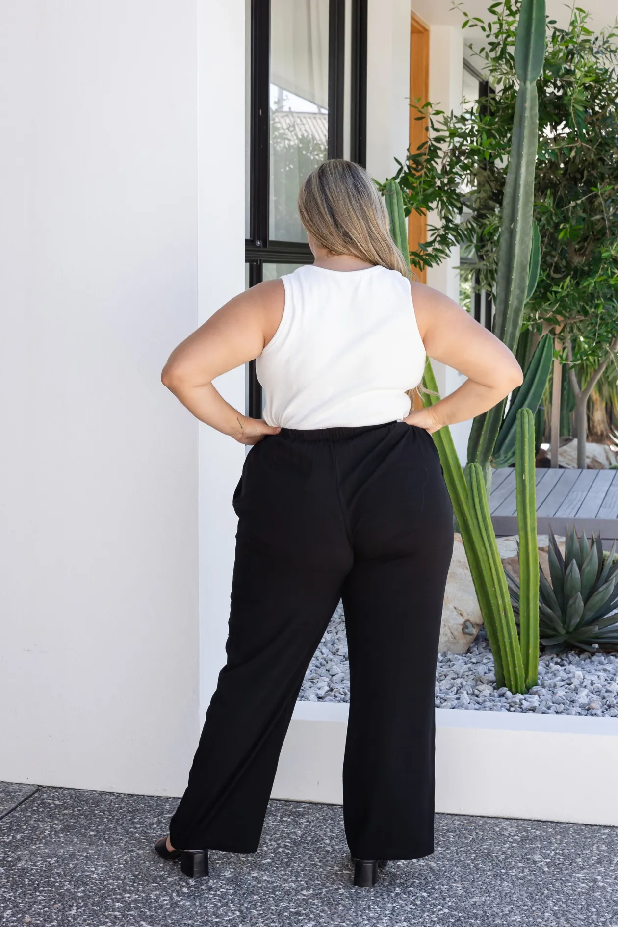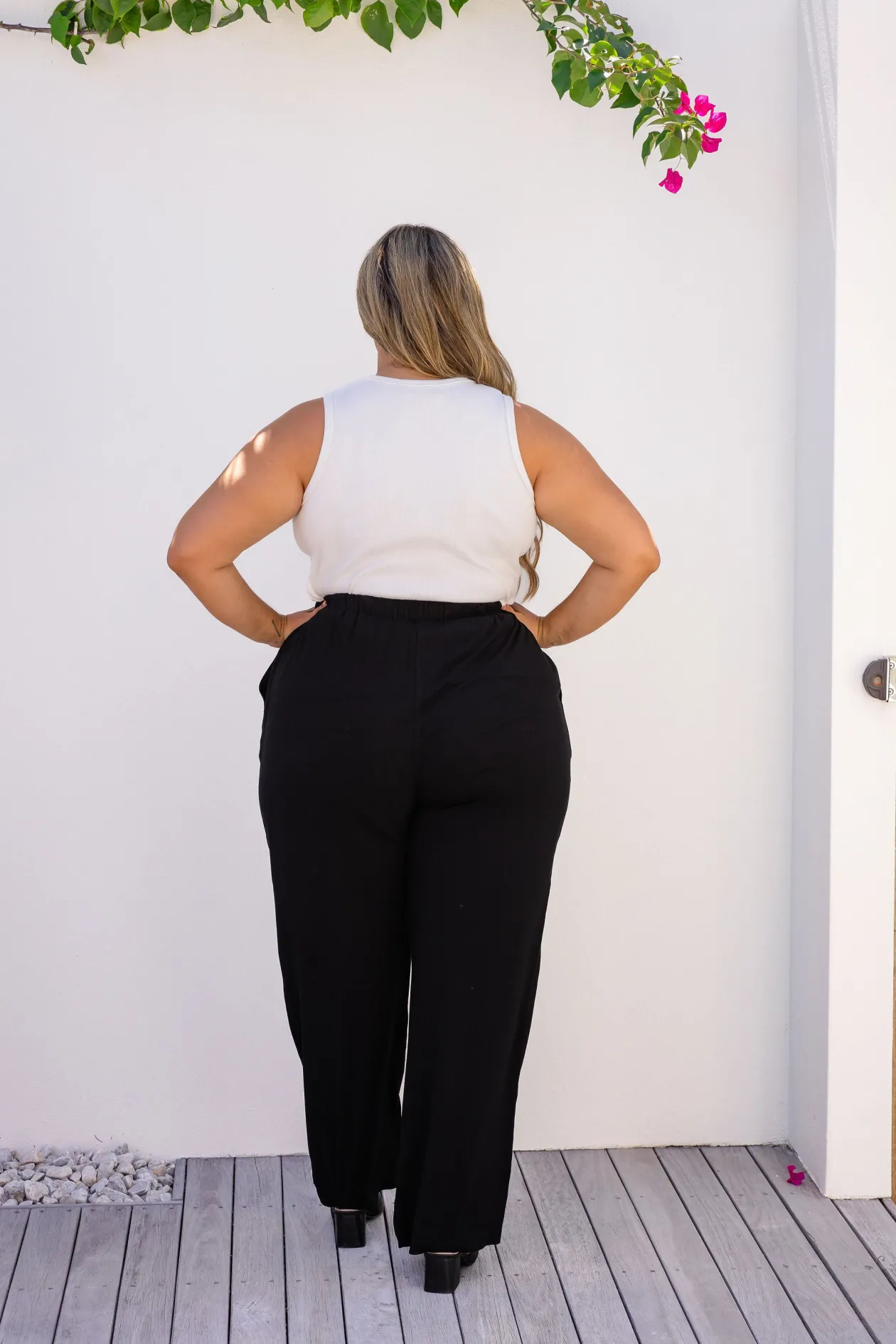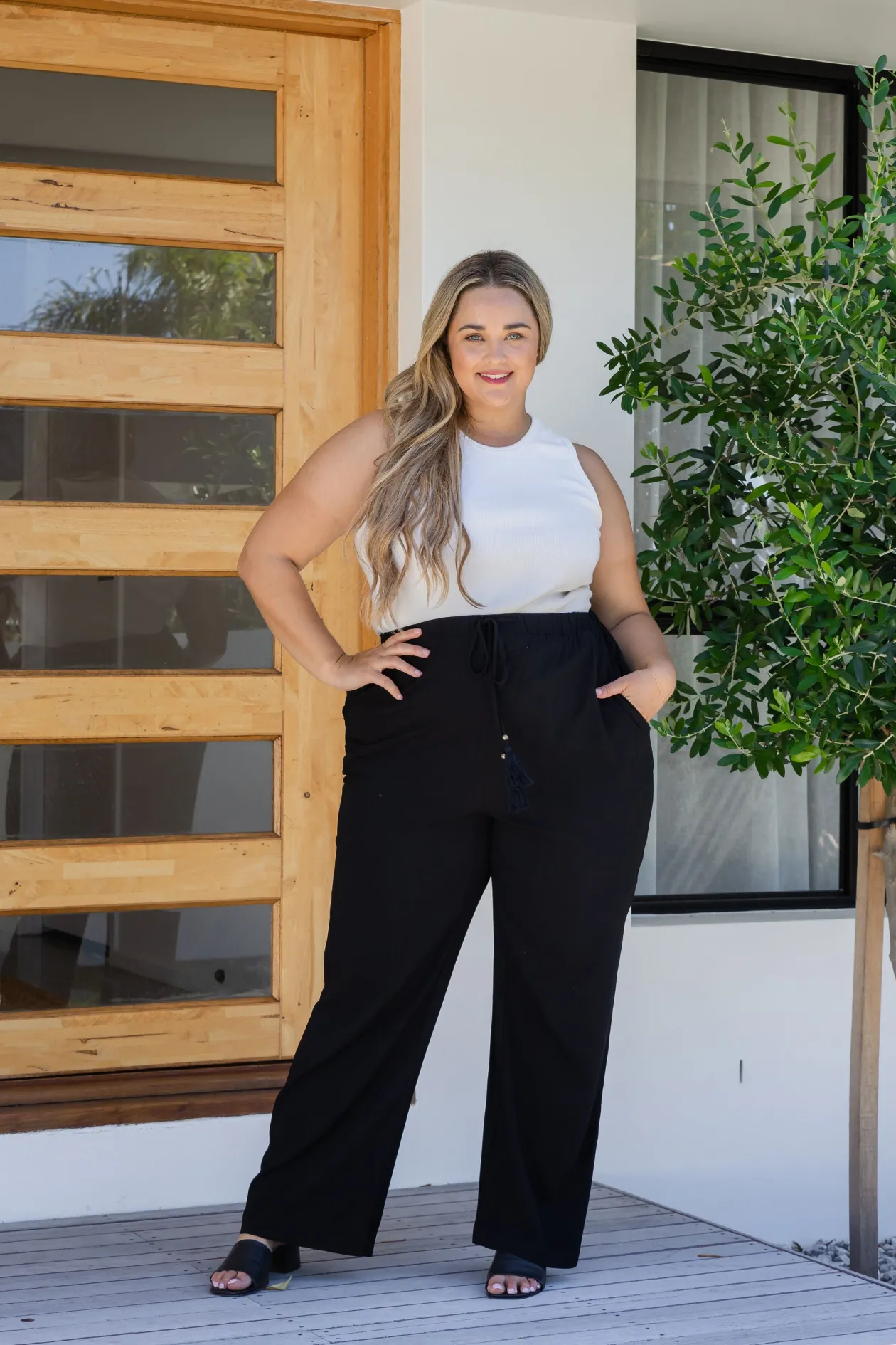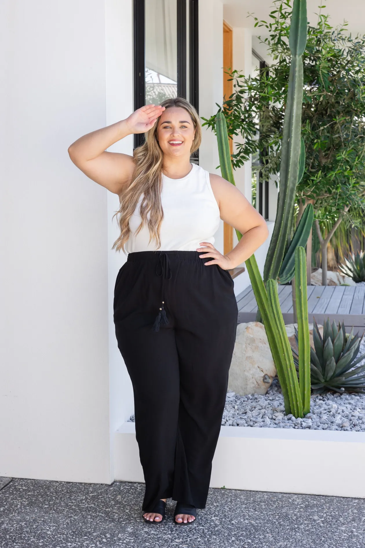 Introducing the Nora Pants, the perfect addition to your wardrobe! Made with comfort in mind, these new pants feature an elastic waistband and convenient pockets. The Nora Pants feature a tassel tie for added flair. Now available in black, these pants are a wardrobe staple.