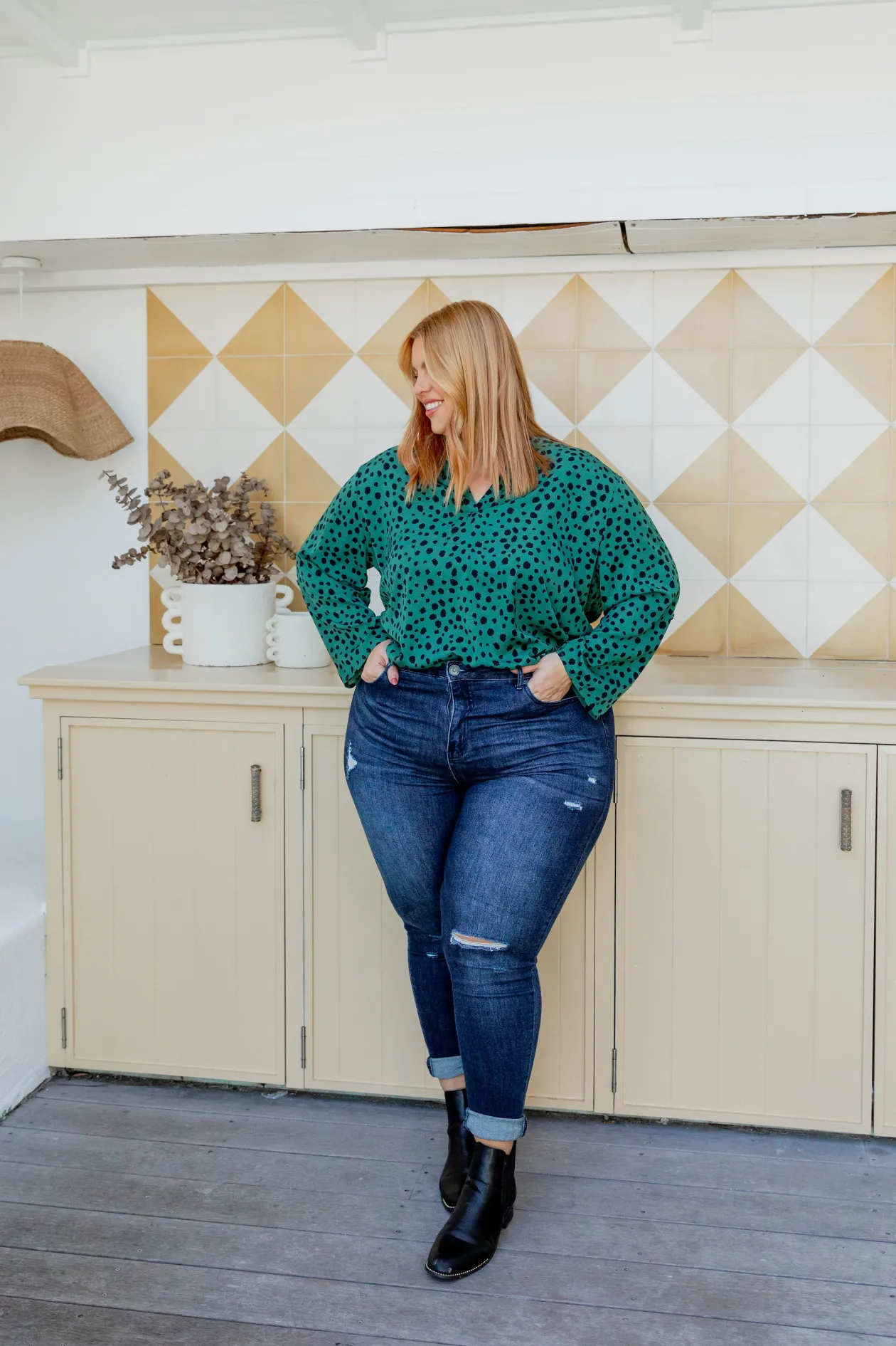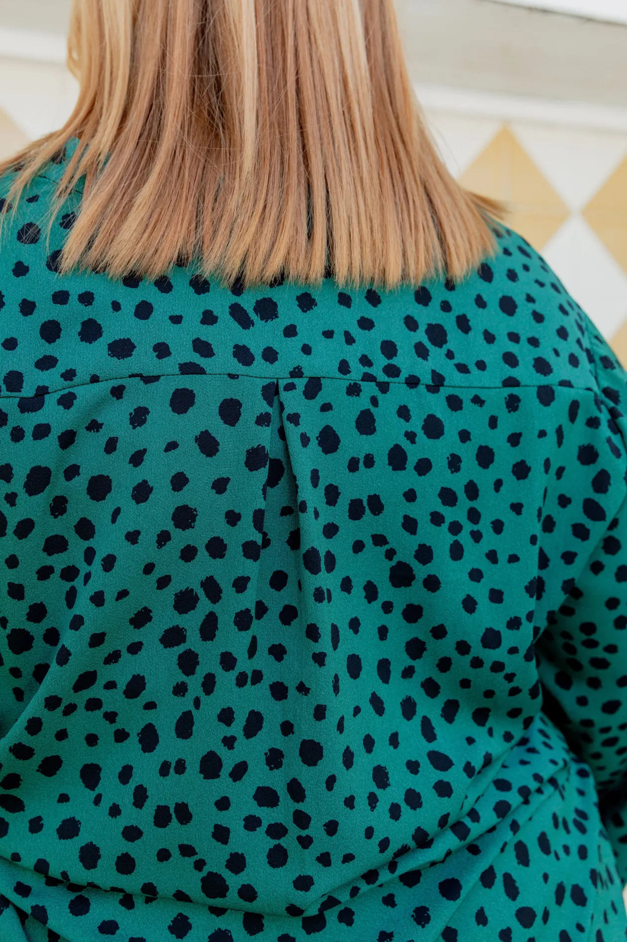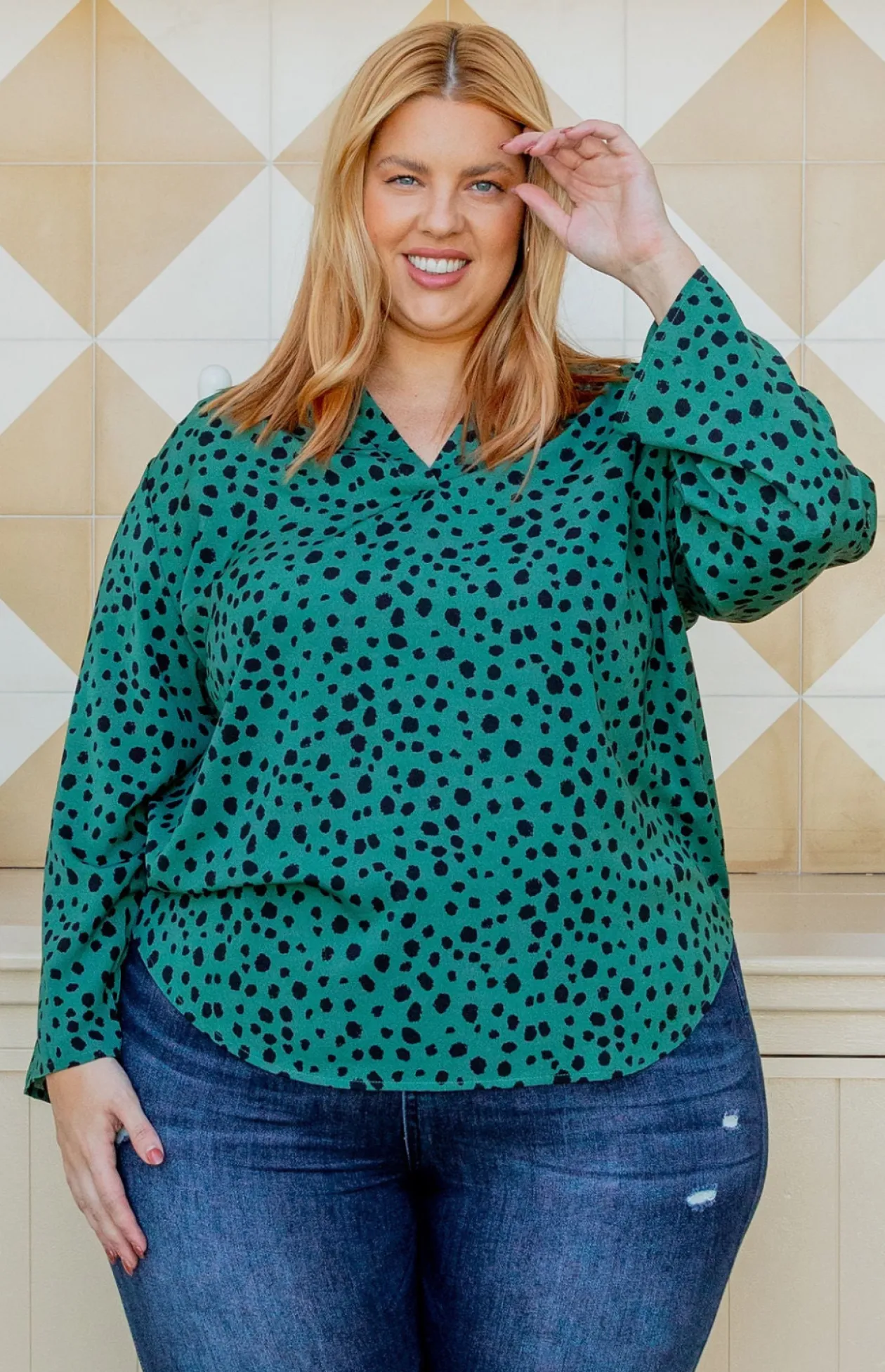 Elevate your office wardrobe with our Olivia Top. This sophisticated green blouse like top with black spots is perfect for creating a polished, professional look. The tailored, relaxed fit will ensure you stay stylish and comfortable throughout your workday.<b data-mce-fragment=