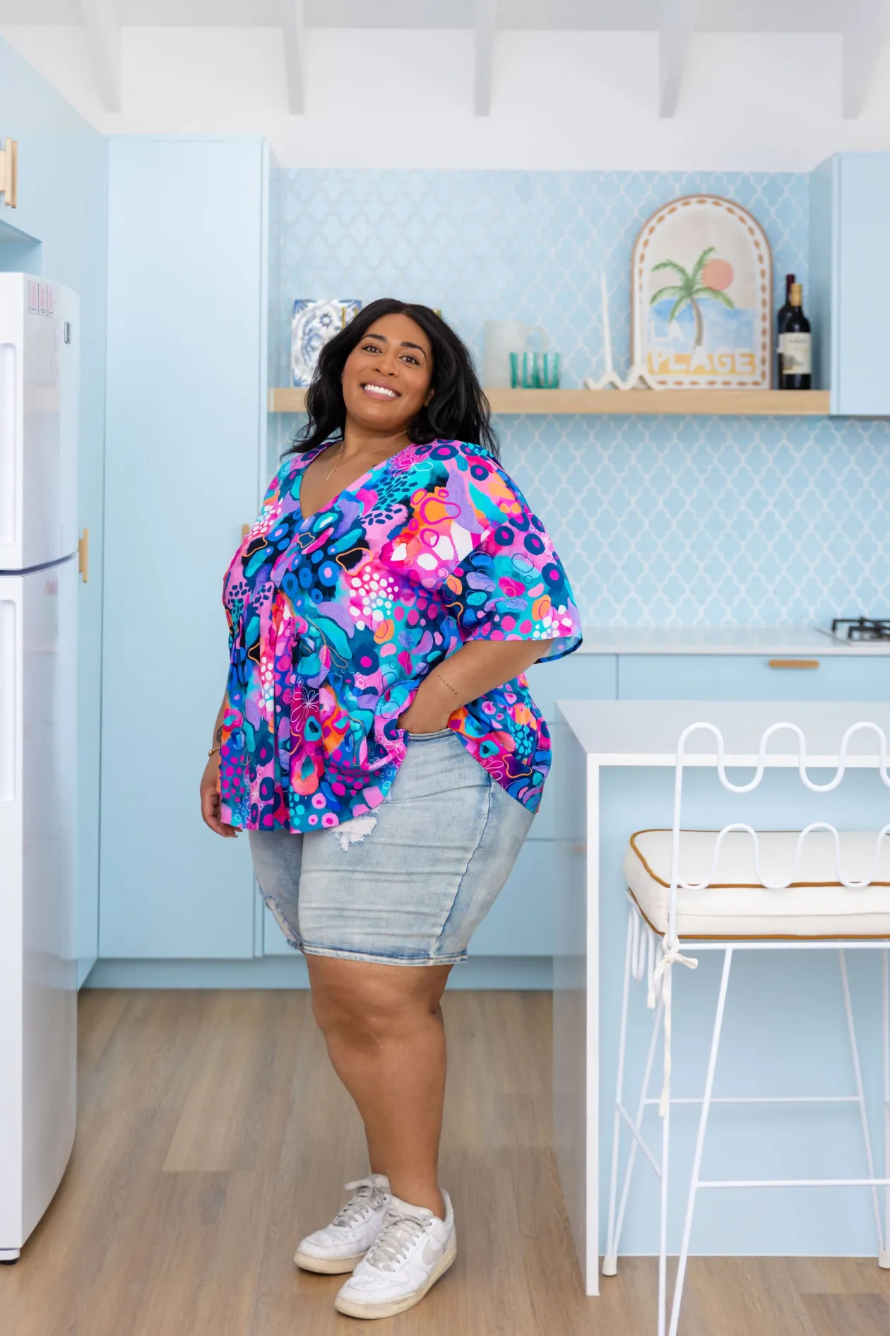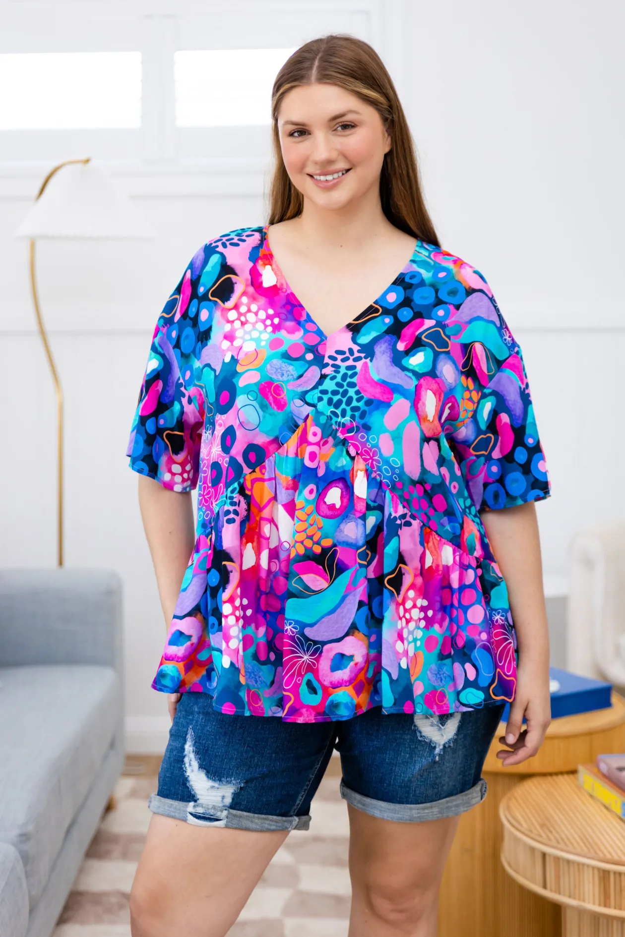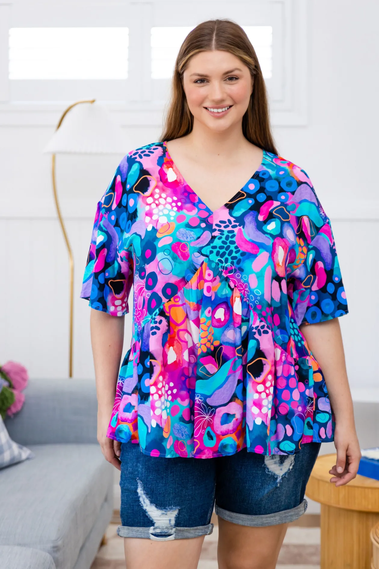 Add a pop of fun to your wardrobe with the Peak Top in Midnight Safari by Kasey Rainbow! Featuring a flattering V-gathering under the bust, playful frill hem, and a relaxed fit, this top is perfect for effortless style. The 3/4 sleeves bring an extra touch of flair, making it your go-to for both casual days and nights out. Available in sizes 6-30!