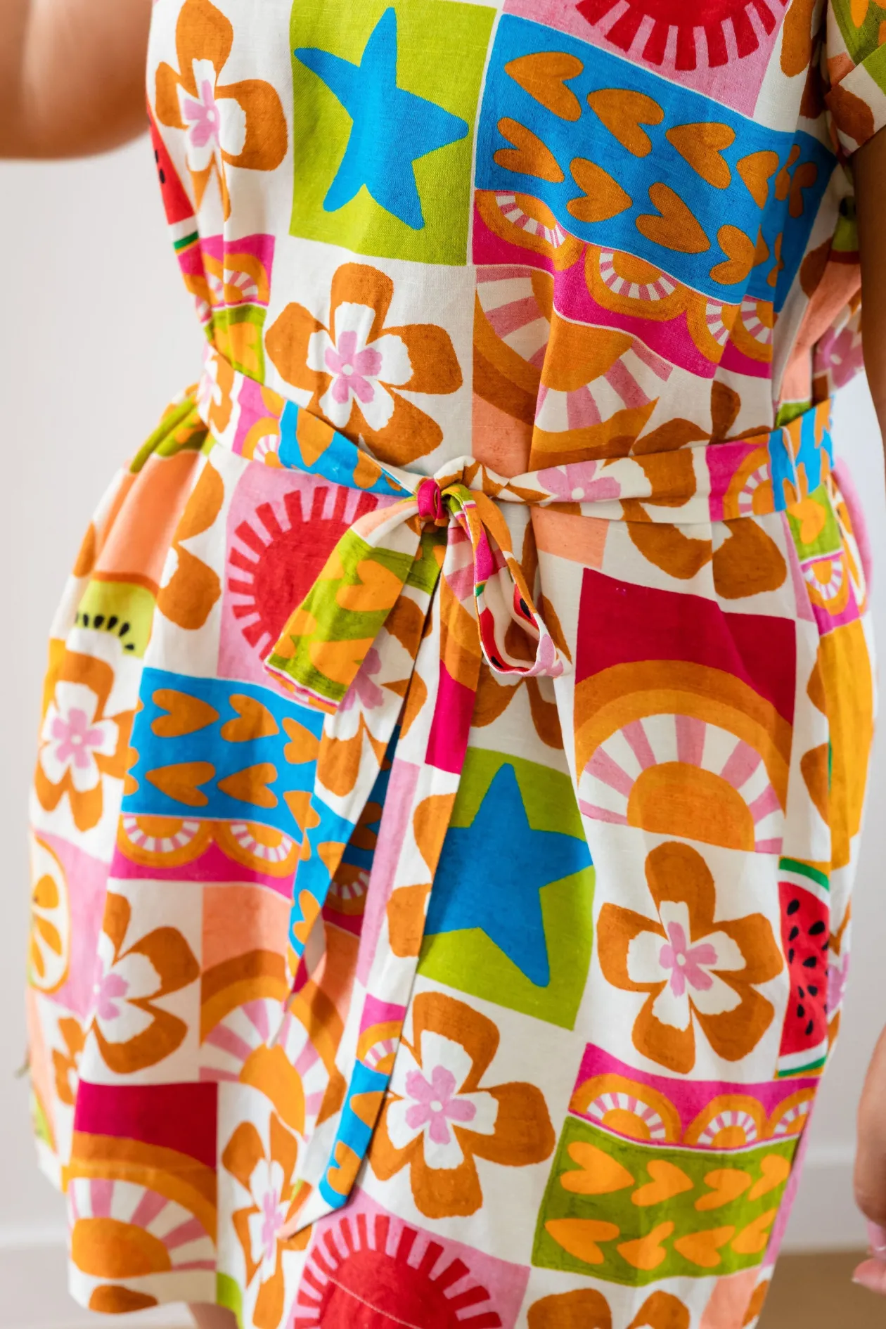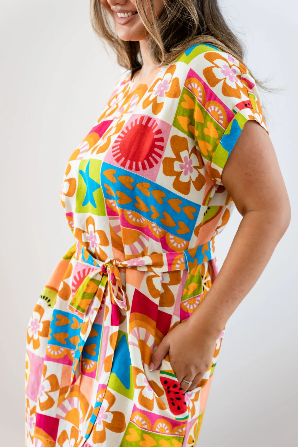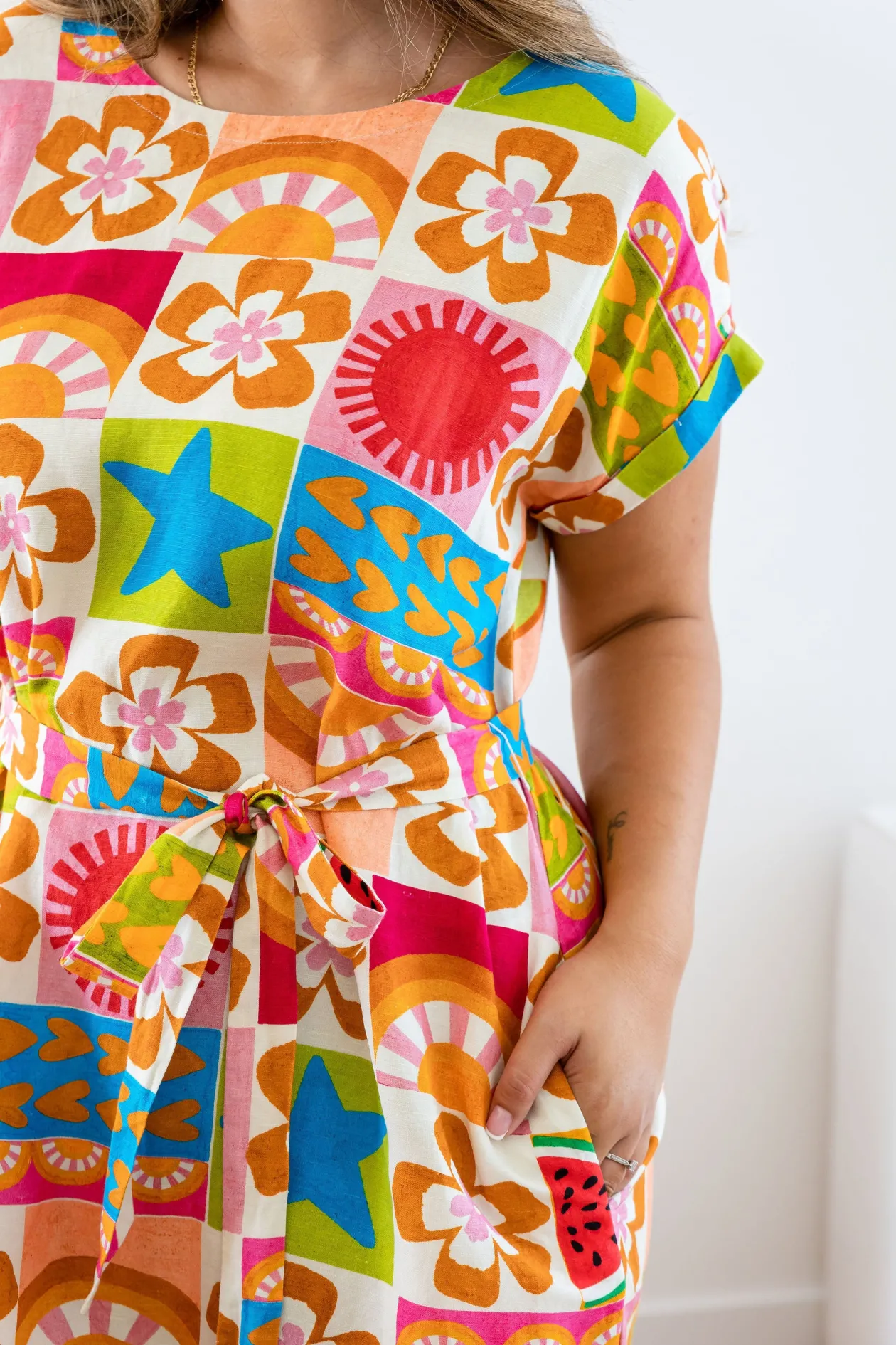 Make a statement in our new Summer Crush print! Adorned with geometric shapes in shades of pink, orange, red, teal, cream and green. This playful dress features a round neckline, removable tie waist, and T-shirt sleeves with a folded hem. Its box style shape provides a relaxed fit and the added bonus of pockets. Available in sizes 6 to 30.